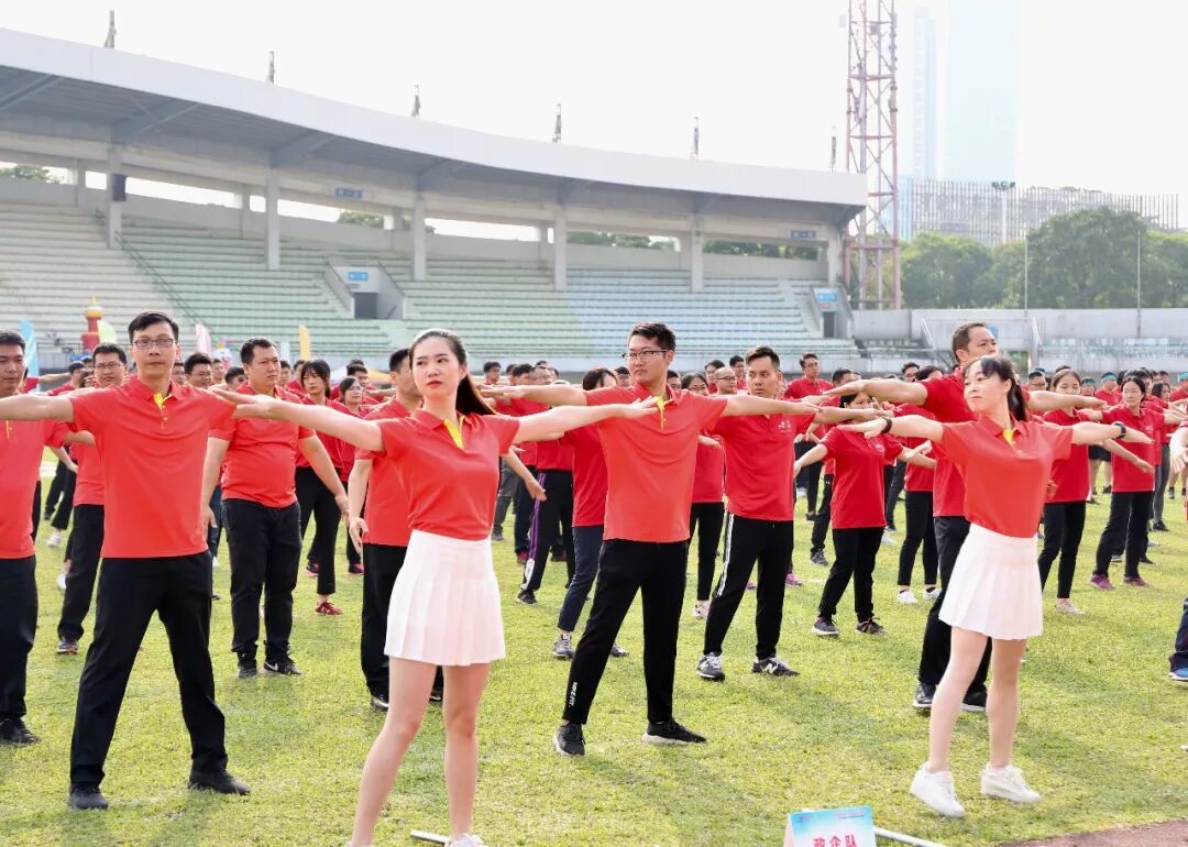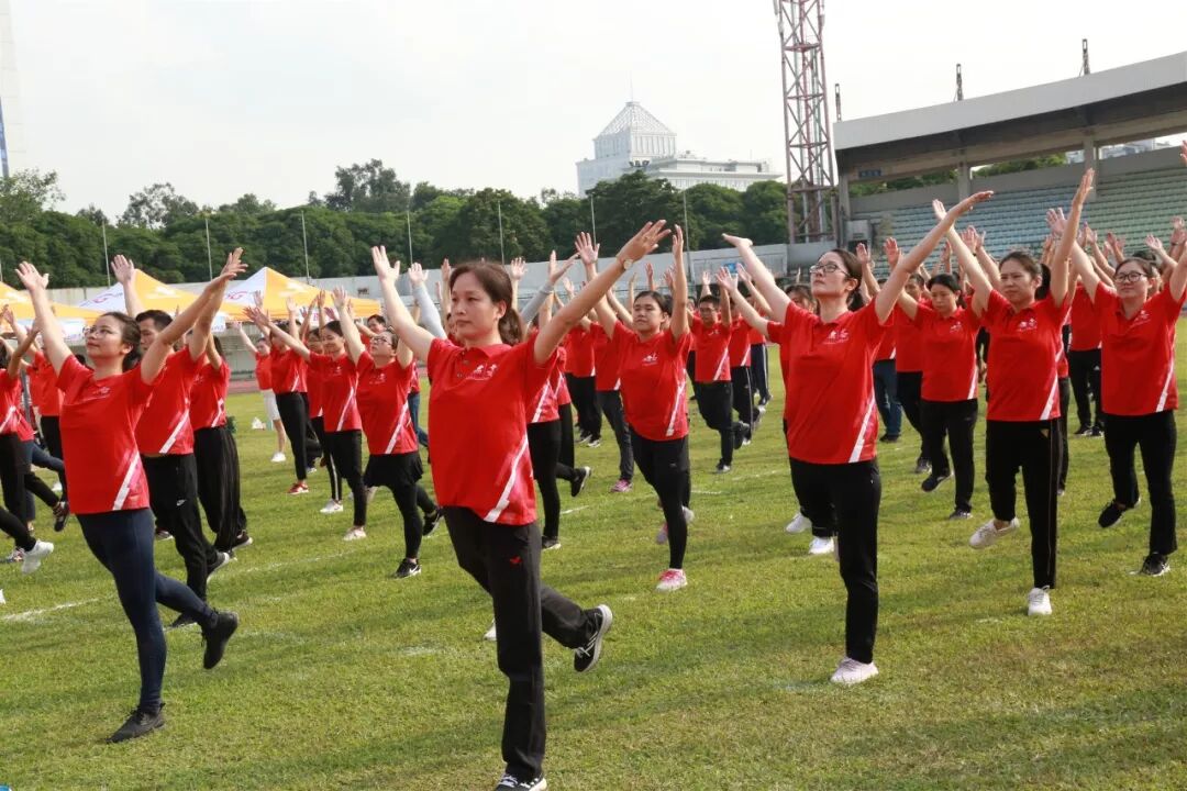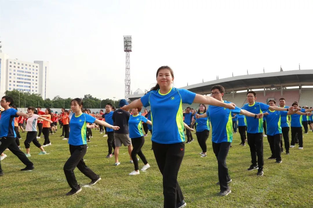 体育场上,迎着朝阳,伴随着嘹亮的广播操音乐,场上的全体人员踏着欢快的节拍“翩跹起舞”,动作舒展、整齐划一,充分展示了中山联通人青春阳光、健康自信的一面。