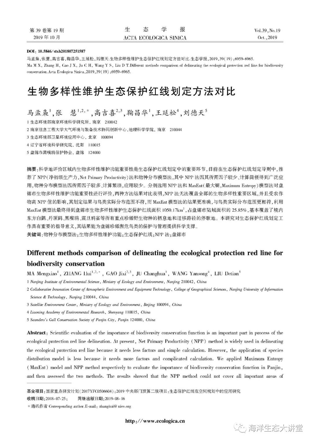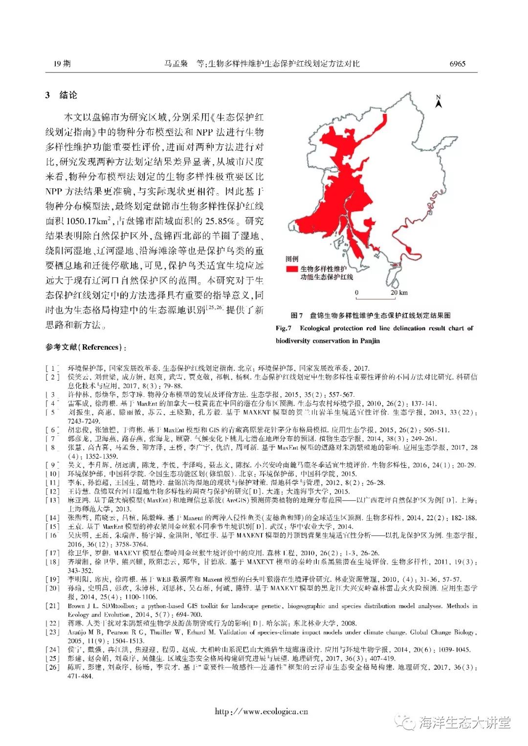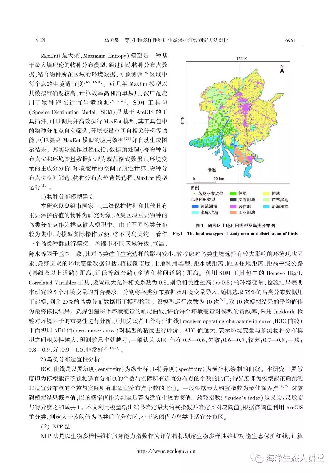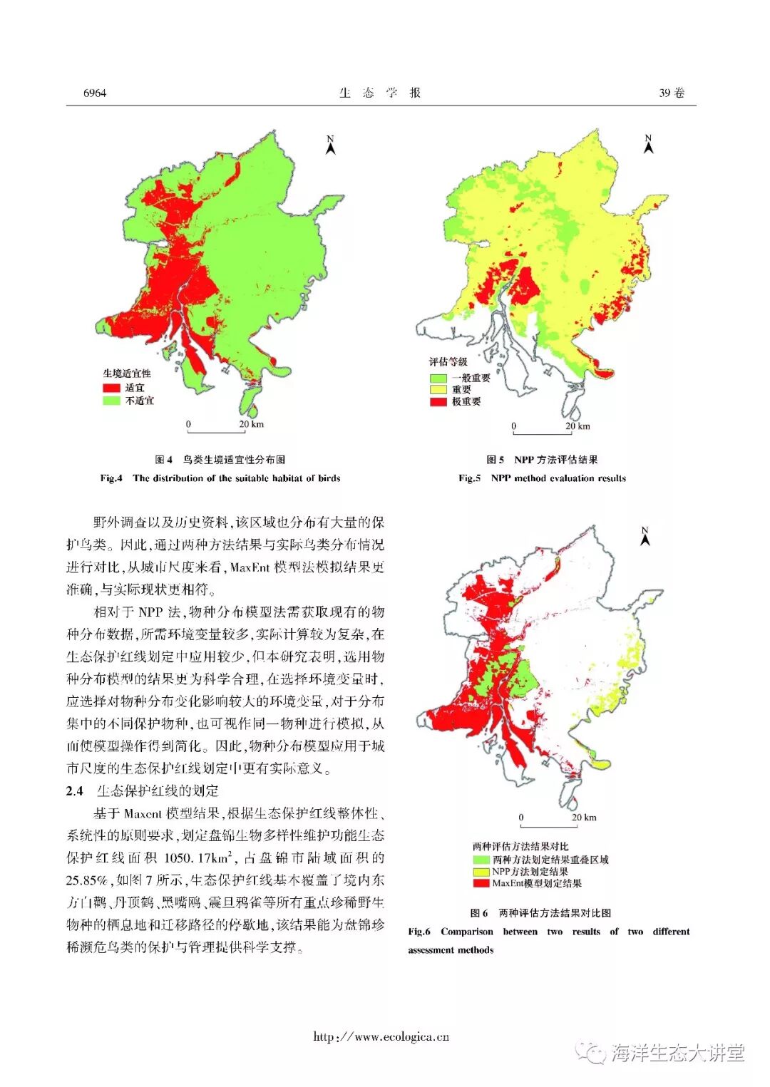 摘要:科学地评价区域内生物多样性维护功能重要性是生态保护红线划定中的重要环节,目前在生态保护红线划定导则中,推荐了NPP (净初级生产力,Net Primary Productivity)法和物种分布模型法,其中NPP法因其所需因子较少、计算简便得到广泛应用,物种分布模型法因所需因子较多、计算繁琐,应用较少。分别选用NPP法和MaxEnt (最大熵,Maximum Entropy)模型法对盘锦市生物多样性维护功能重要性进行评价,两种方法结果对比表明,NPP法无法覆盖全部的生物多样性重要区域,并且受农作物高NPP值的影响,其划定结果与鸟类实际分布范围不符,而MaxEnt模型法的结果更准确,与鸟类实际分布范围更相符,利用MaxEnt模型法最终得到盘锦市生物多样性维护生态保护红线面积1050.17km2,占盘锦市陆域面积的25.85%,基本覆盖了境内东方白鹳、丹顶鹤、黑嘴鸥、震旦鸦雀等所有重点珍稀野生物种的栖息地和迁移路径的停歇地。本研究对生态保护红线划定工作具有重要的指导意义,其结果能为盘锦珍稀濒危鸟类的保护与管理提供科学支撑。关键词:物种分布模型法 生物多样性维护功能 生态保护红线 NPP法 盘锦市