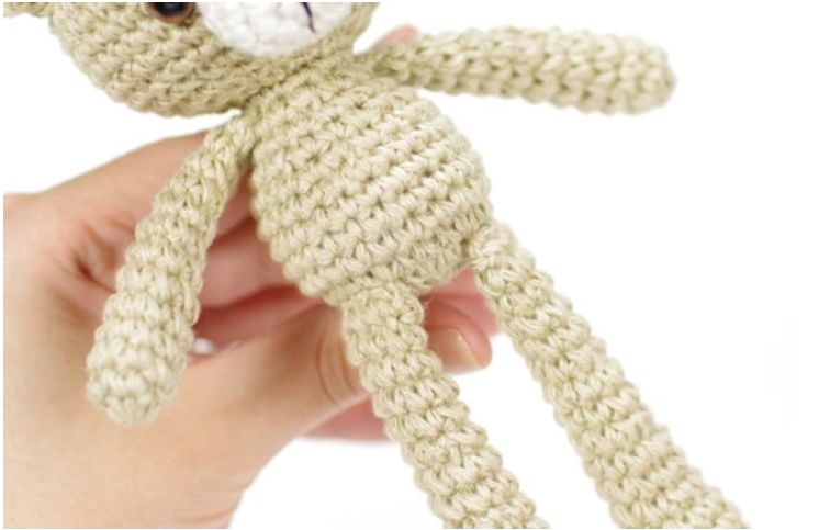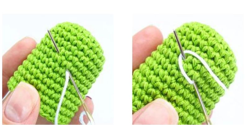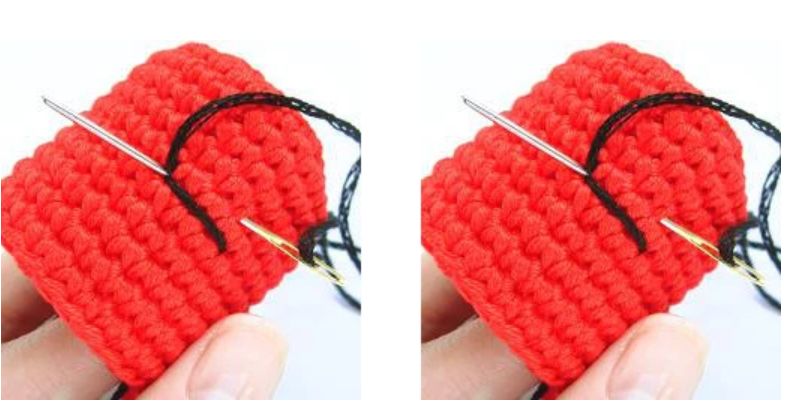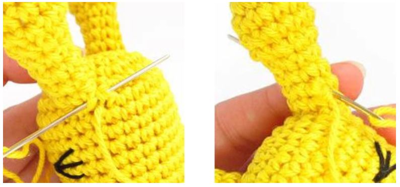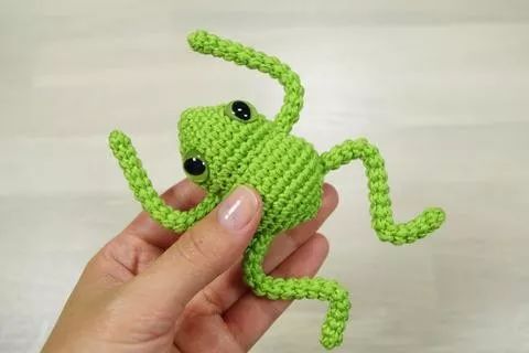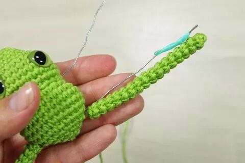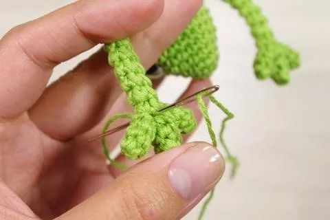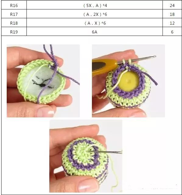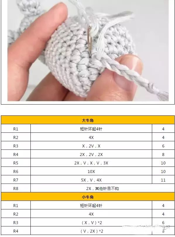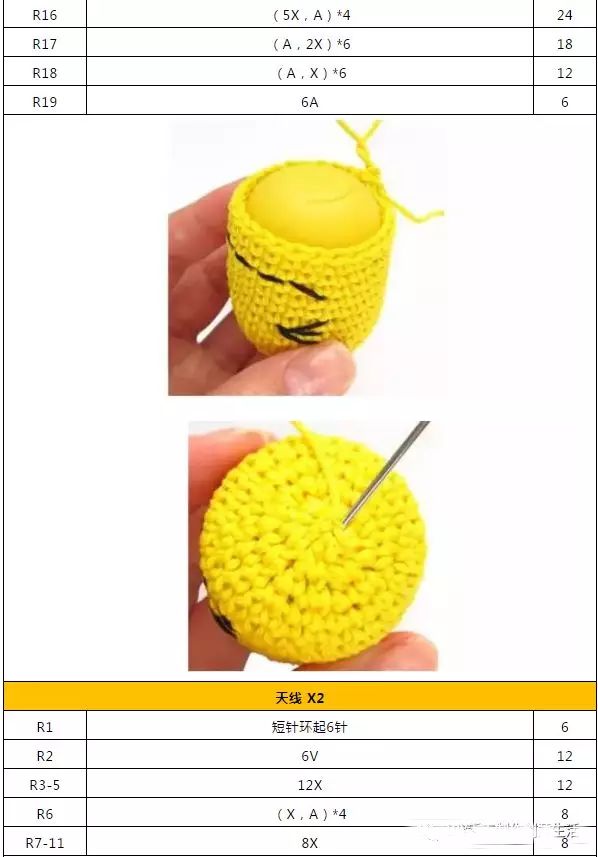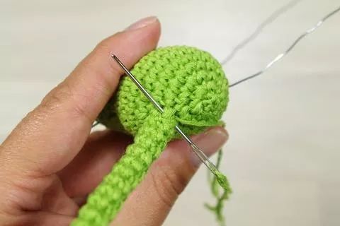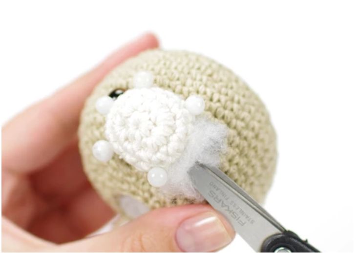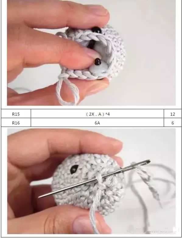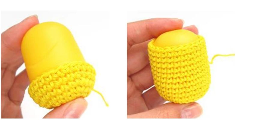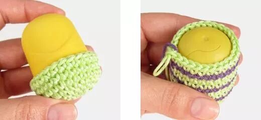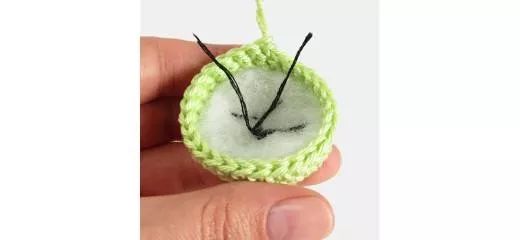 钩织过程中,一边用线缝出不同图案,并填充,或者如图所示,放入摇铃。