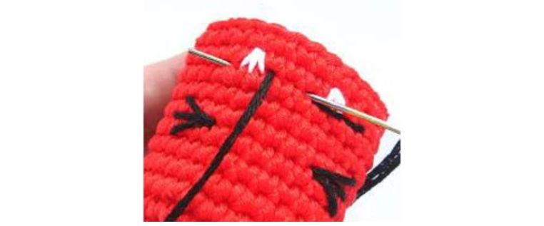 钩织过程中,一边用线缝出猫咪的眼睛、鼻子、嘴巴,并填充,或者如图所示,放入摇铃。