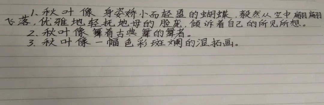 学生课堂作品:他的眼睛如秋天的人工湖,长长弯弯的睫毛如秋天的芦苇荡,包围着清澈见底的湖水,还在泛着点点波光。一天之后这对眼睛中落满了对于工作的疲倦,湖水不再清澈,变得浑浊,就像纯洁的天使落入人间,沾染了人间的烟火气。