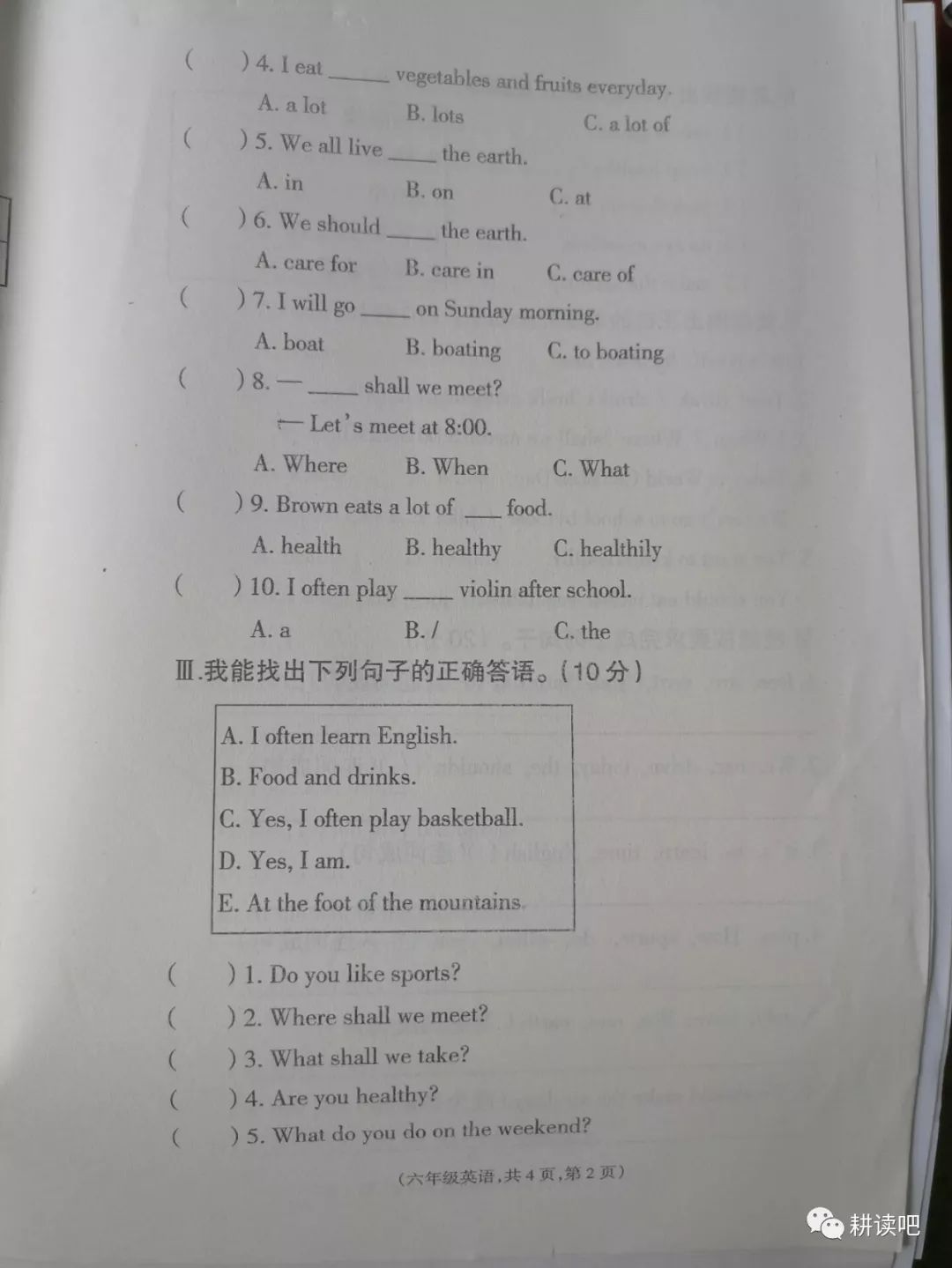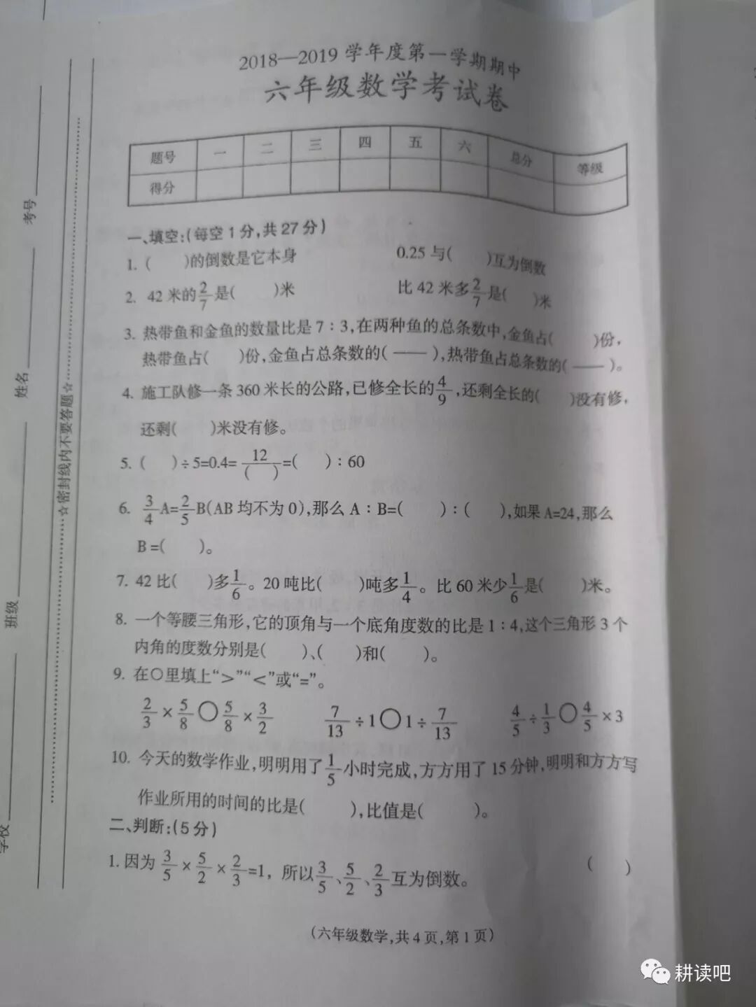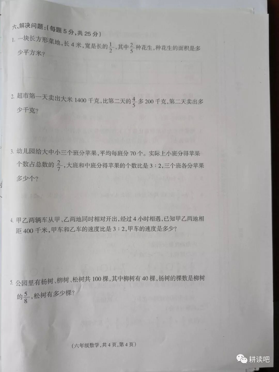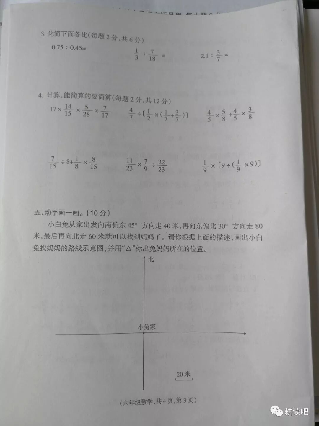白日耕田夜读书 点击上方“耕读吧” 六年级上数学期中试卷