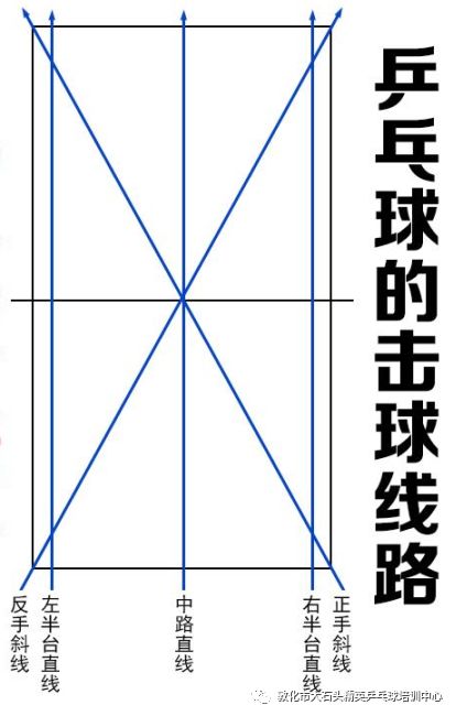 除中路直线外,其它四条击球路线中,两条斜线通过台角,两条直线接近台角,这是构成对角攻击的战术基础。