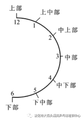 球的上部:接近12点的部位。球的中上部:接近1-2点的部位。球的中部:接近3点的部位。球的中下部:接近4一5点的部位。球的下部:接近6点的部位。
