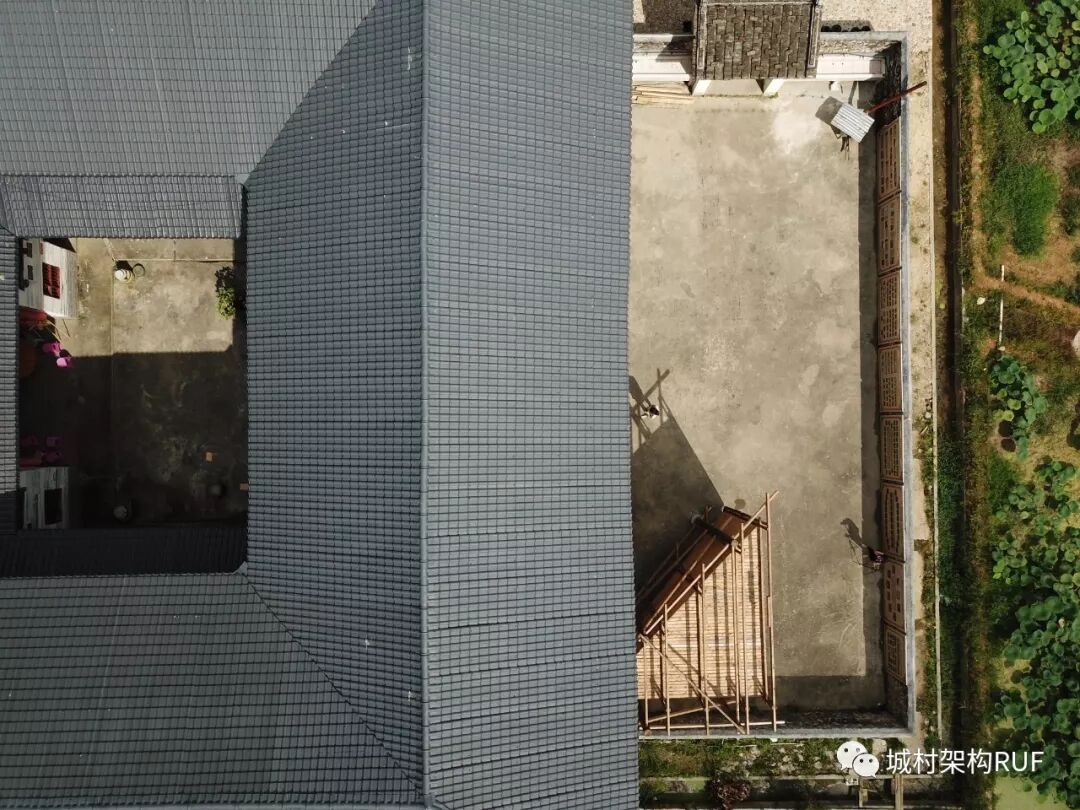 与“插件Plug-In”一样,该结构也同时面向外部空间。铺面板沿着台阶放置在栏杆的内部,而最后一级台阶与内部屋顶的屋檐维持同一水平高度,从而形成了一个可以供人们端坐在土楼宁静且受遮蔽的庭院内观赏土楼外地平线风景的平台。