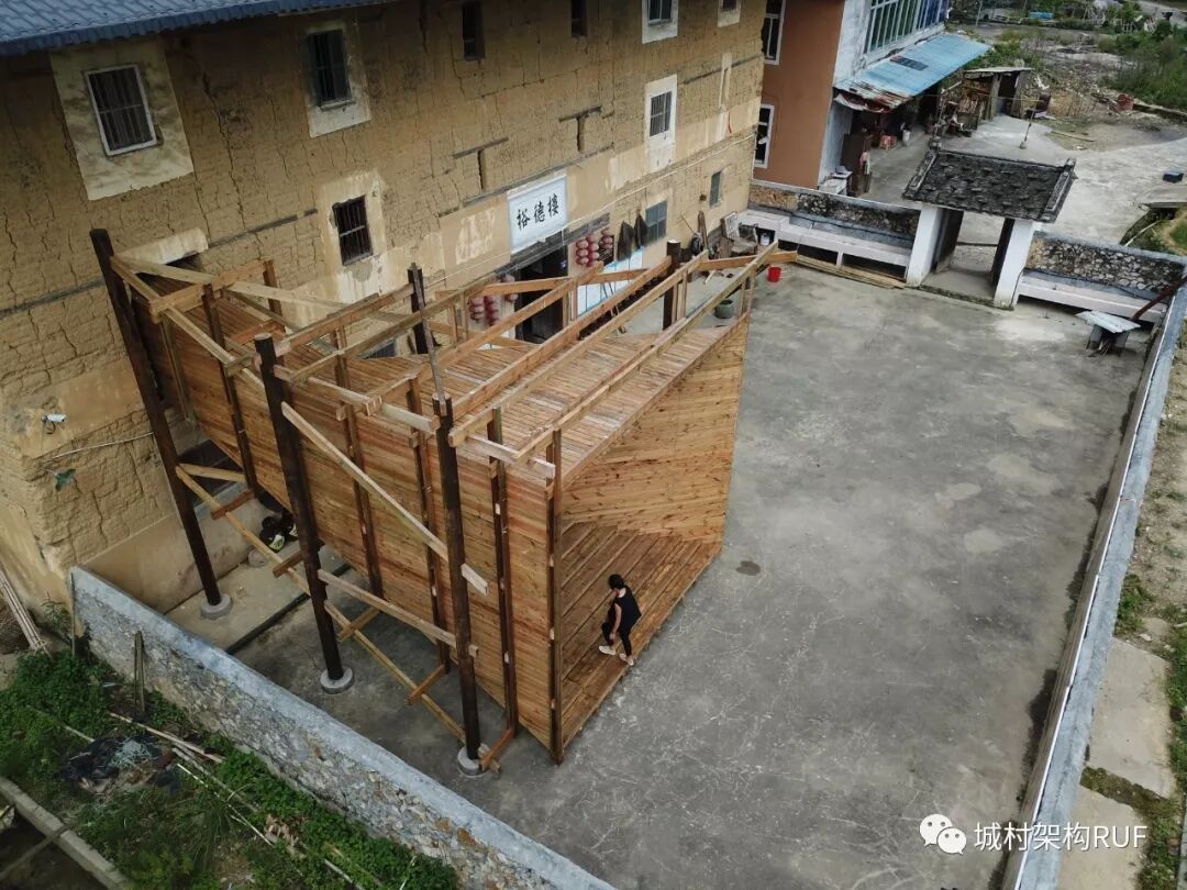 拥有500年历史的土楼外廊结构的重要性则体现在这座新的高12米的木塔上。新旧结构之间的连续木栏杆由环绕着一根中央立柱的螺旋楼梯连接起来,每层土楼则由一系列桥梁与楼面相连。