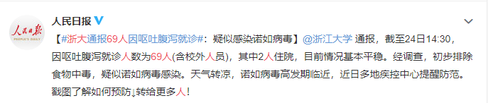 监测数据显示,每年10月到次年3月是诺如病毒暴发流行的高发季节,感染高峰一般出现在10-11月。