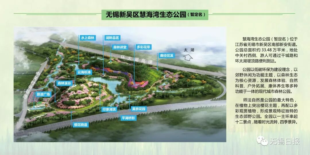 规划面积450亩,总投资约1亿元。公园以“乐活山水、印象锡山”为主线,围绕健康环形步道,室内运动与文创办公,户外棒球、足球、门球等功能运动场地,打造融“滨水、生态、运动”等元素为一体的创新、乐活新天地。