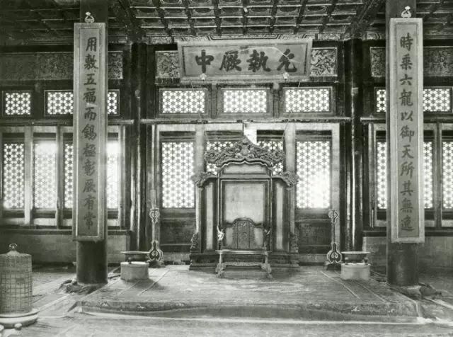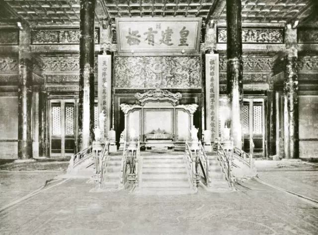 台座南、东、西有阶梯,四周有栏杆。从照片中看出这座世人心目中的的“圣殿”内部并不整洁,地毯不平整,且包边已经破烂;须弥台脚与东侧栏杆交接处有一破损的花棂窗构件,此样式构件只在太和殿前后门扇上才有。此时的太和殿依然是皇权的象征,但皇家的威严已荡然无存。