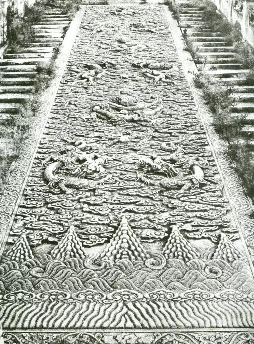 小川一真在拍摄时,未显示建筑构件的粗大,让一在场的中国人张双臂抱住龙柱以作参照。照片中的人一身短打扮,手的骨节粗壮,应为从事体力劳动的人。盘龙柱上的沥粉比现在看到的更突出、线条也更遒劲。