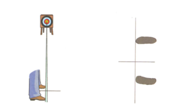 传统射箭采用的主流站立方法是一字平行式,又称侧立式。动作要领:侧对着靶子站立,两脚开立与肩同宽,双腿、身体和两肩保持在一个平面,身体垂直于地面,重心落于前脚掌,保持身体对称性。如下图所示。