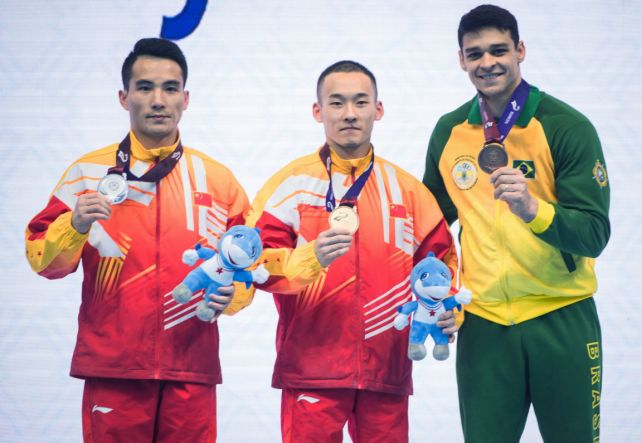 中国选手肖若腾(中)、亚军中国选手邓书弟(左)和季军巴西选手巴雷图在颁奖仪式上