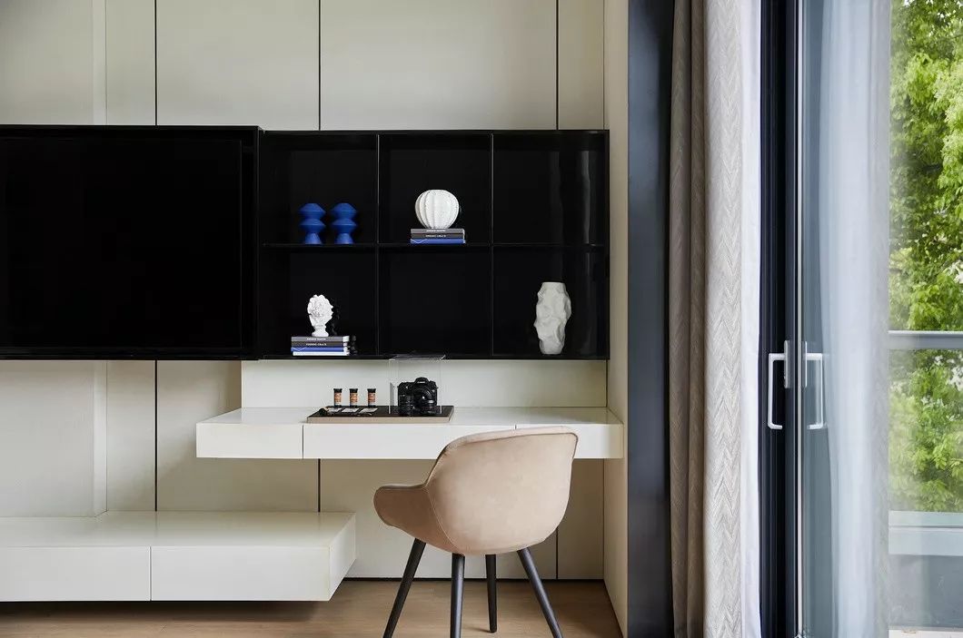 主卧套间用穿透手法连接各区域,由安眠的米色调卧室向沉稳棕木色衣帽间深入,进而踏入极简白的卫浴间。卧室线条细节由立面至顶面延伸,窗景引入,起居生活与自然的联系更趋紧密,让净、简、素的基底更具活力与生机。