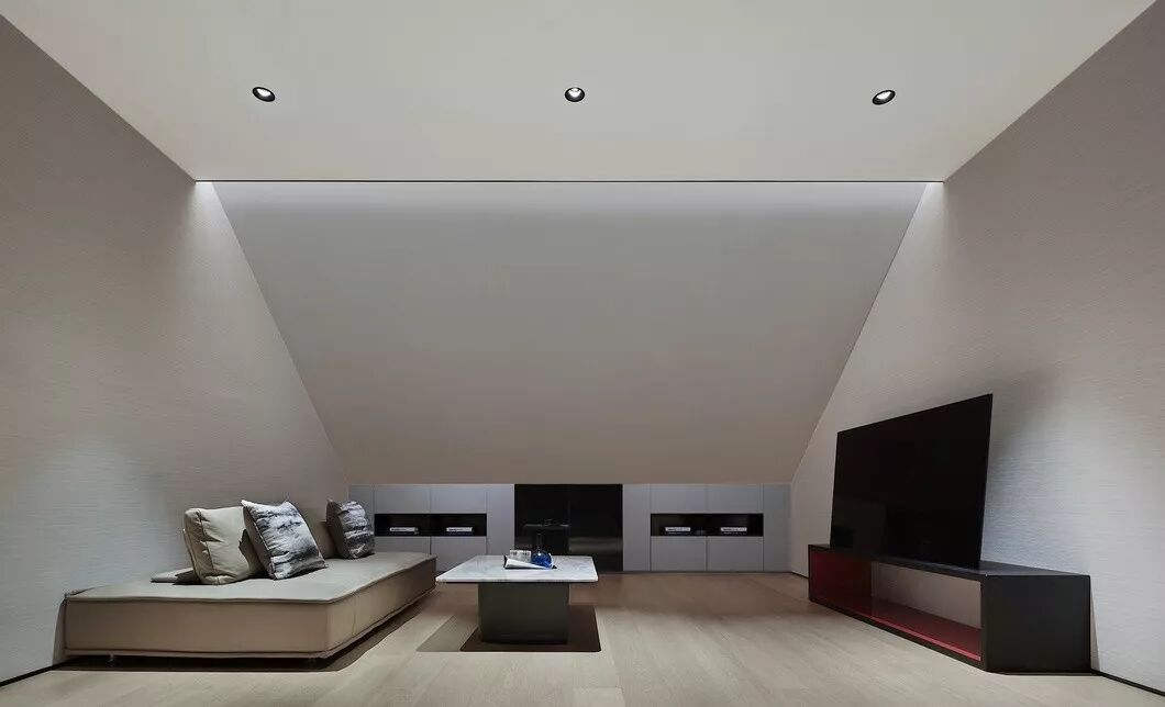 三楼设有书房、客厅、客卧、露台及榻榻米等区域,注重赋予其更多灵活可塑性,也为未来生活的后续需求留有发挥余地。露台与客厅开放互联,切面视觉让空间框架彰显趣味。斜顶开设天窗,以柔和方式留住适宜的照度,使书房更显宁静、祥和之气。