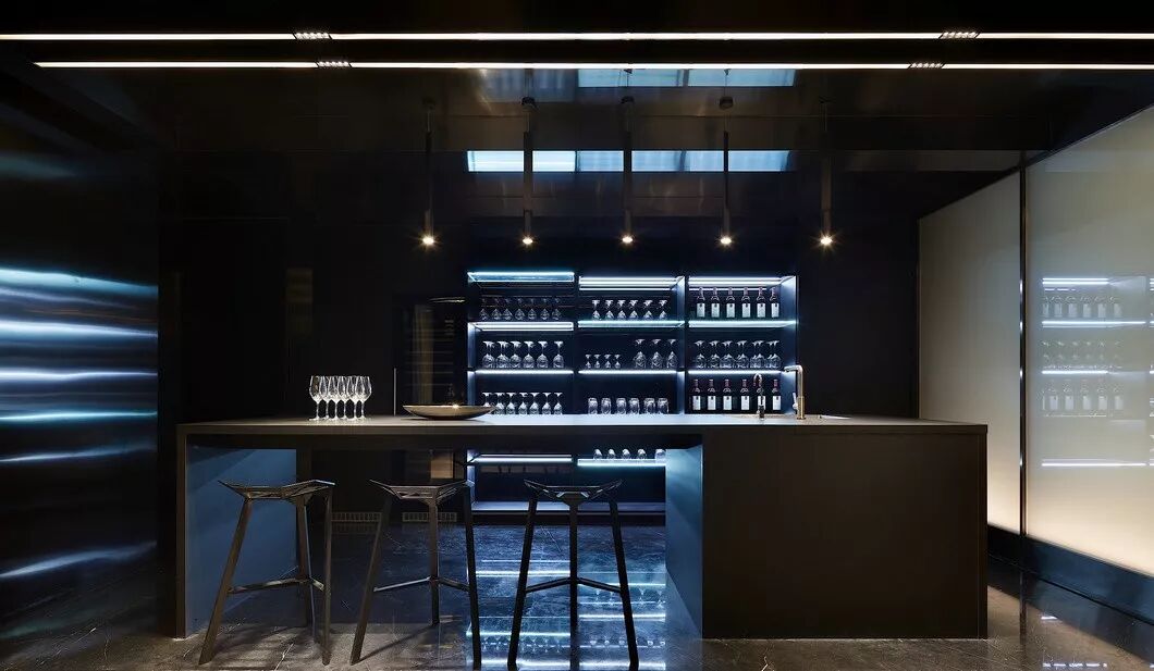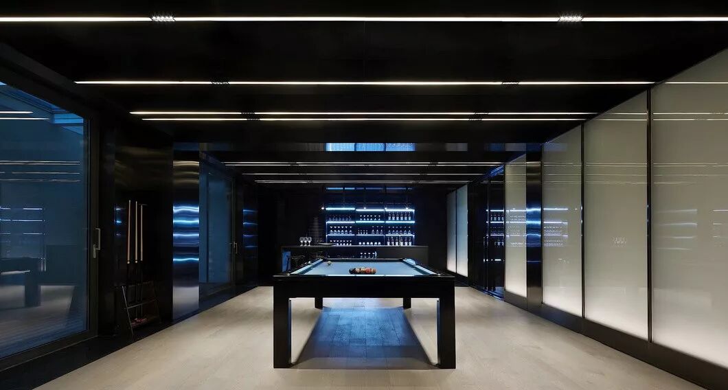 地下一层为休闲娱乐空间,品酒区、台球室、影音室、乒乓球室一应俱全,满足业主多元化的功能需求。台球室与品酒区一体而成,经由俊朗的材质强调线条垂直感以及映射延展性,塑造出丰富的立体构成。
