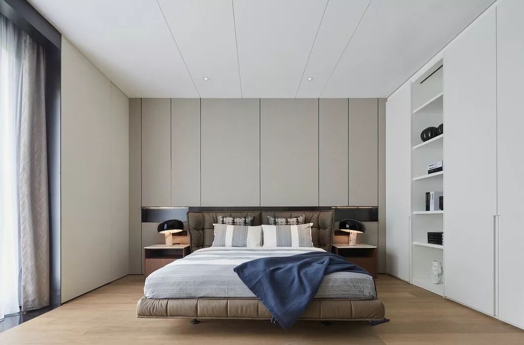 卧室选用单纯的灰调与温和的材质,散发安宁恬静的气息,忠于空间的本质功能。