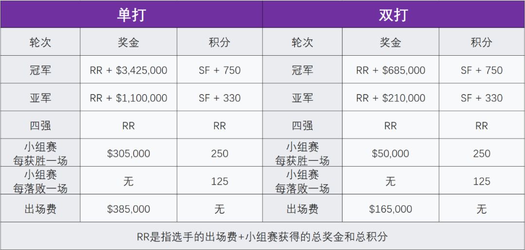 今天单打红组和双打紫组的比赛率先进行,明天则将进行单打紫组和双打红组的比赛,隔日交替进行一直持续到周五。周六进行半决赛,周日则将上演最后的决赛。每天比赛的详细日程如下: