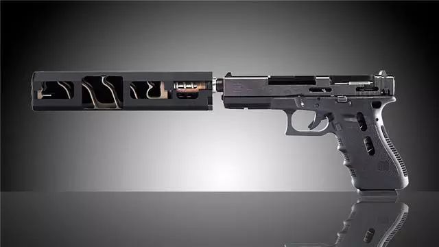 成功推出格洛克22手枪后,格洛克公司有专门为美国安全部队研发了格洛克20手枪,专门用于发射美国联邦调查局(FBI)的10毫米子弹,枪口初速380米/秒,弹容量15发。上图是格洛克20手枪装配消音器后的剖面图。