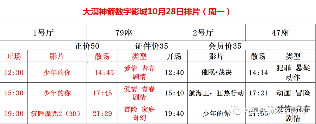 大漠神箭数字影城10月28号排片计划(周一)