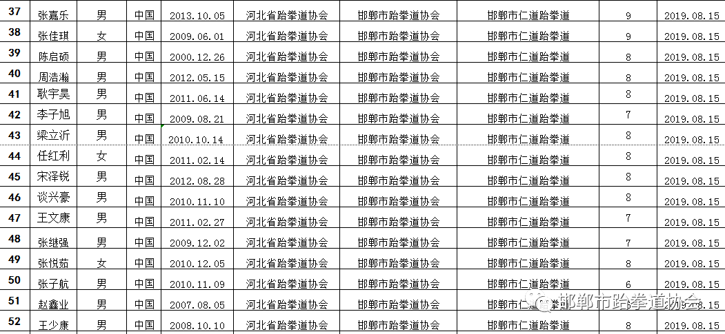 道馆名称仁道跆拳道俱乐部地点河北省邯郸市邱县实验小学西行50米路南时间2019年8月15日考试人数52人晋级官刘莉九级32人