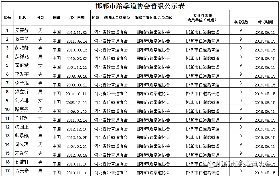 晋级大会公示(2019.8.15)仁道跆拳道俱乐部