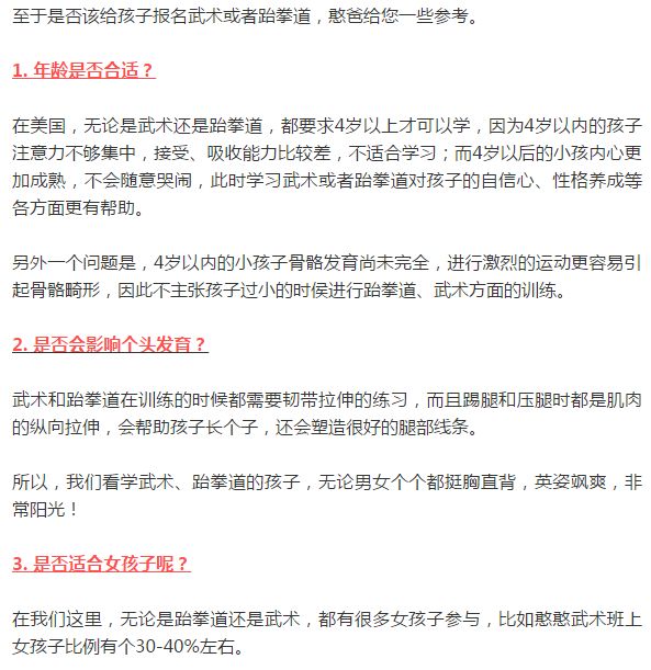 其实,无论是学武术还是跆拳道,我们目的就是为了培养孩子坚韧的性格,强壮的体魄,无论选哪个,对孩子的帮助都是极大的!