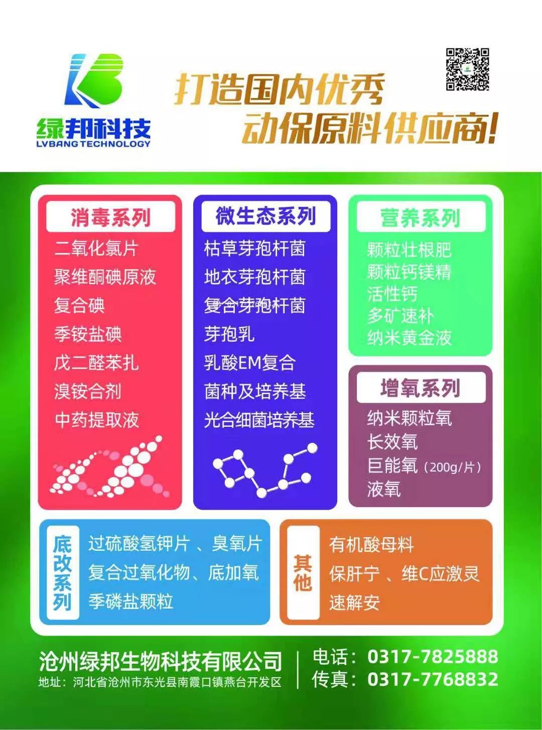 沧州绿邦生物科技有限公司位于中国第一武术之乡---河北省沧州市东光县,距北京市250公里、天津市150公里、石家庄200公里、济南200公里,交通非常方便。本公司是一家集水质改良剂、底质改良剂、消毒剂等的研发、生产、销售和技术服务于一体的高新技术企业。专业为水产动保企业、饲料企业提供优质的动保原料。公司坚持以人为本的经营理念,立足科技创新,不断进步。以科技为导向,追求卓越的产品品质,创一流的管理、一流的技术、一流的品牌。视产品质量和品牌为企业的生命,经公司研发部与中国农业大学、天津农学院、天津市化工研究所、大连海洋大学、广东海洋大学等多所院校的专家合作,成功研发了“绿邦”系列产品。