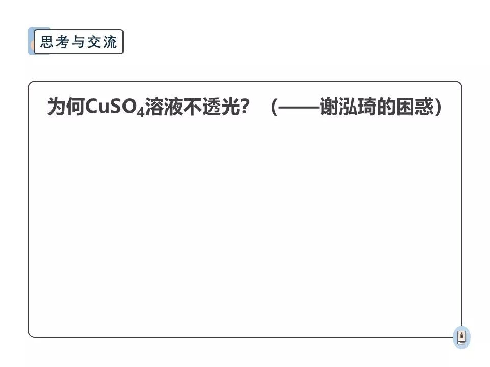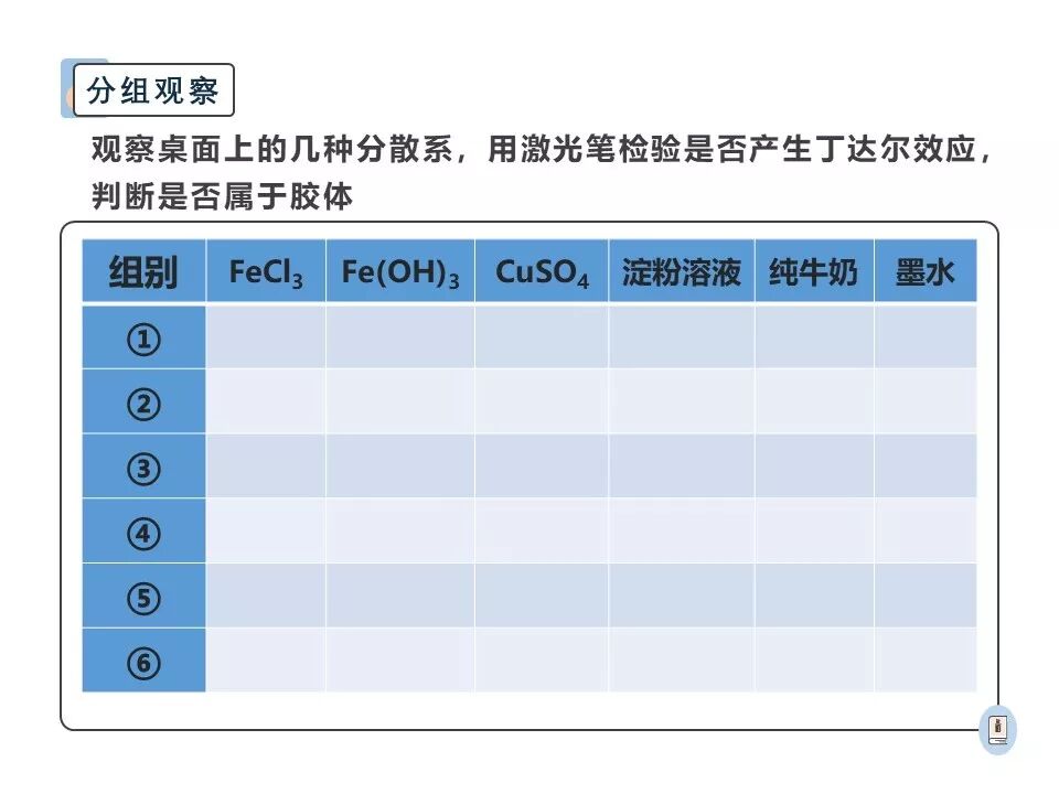 03 课堂上采取分小组,利用激光笔观察溶液和胶体,了解两者的区别,清楚鉴别两者的方法,事先准备了硫酸铜溶液、氯化铁溶液、氢氧化铁胶体、淀粉溶液、牛奶和墨水六种溶液让学生观察。