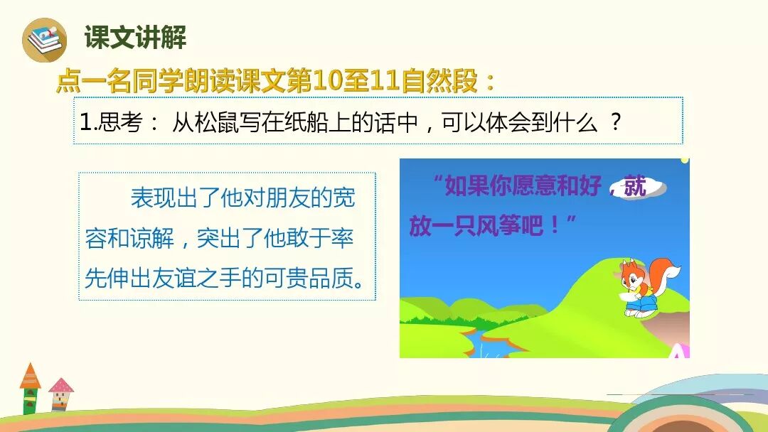 3.过了几天,松鼠再也受不了啦。他在一只折好的纸船上写了一句话:“如果你愿意和好,就放一只风筝吧!”
