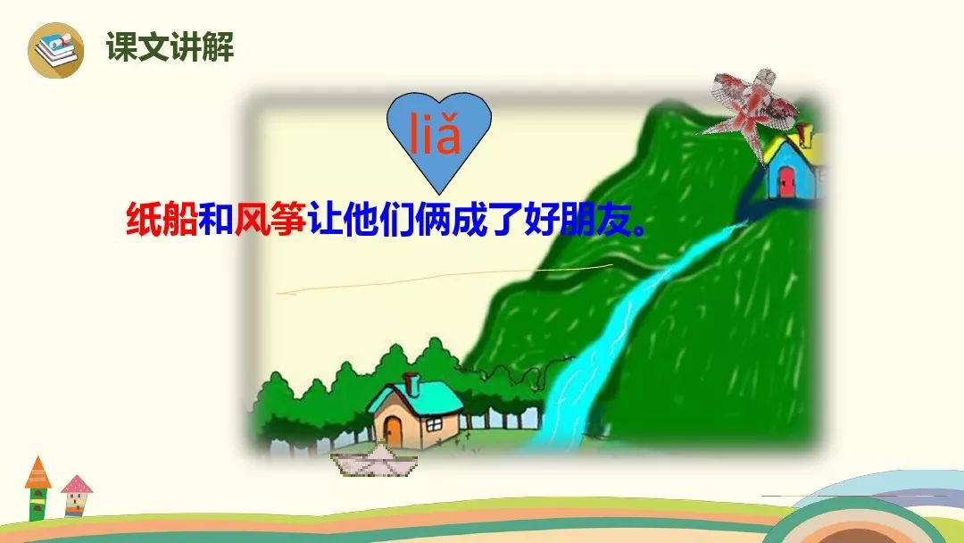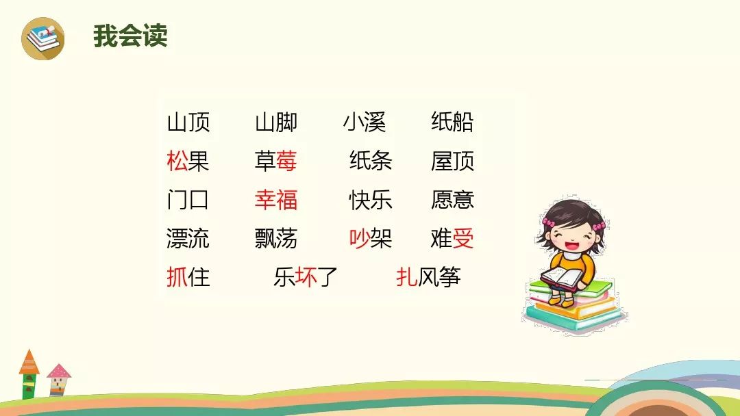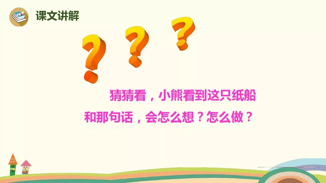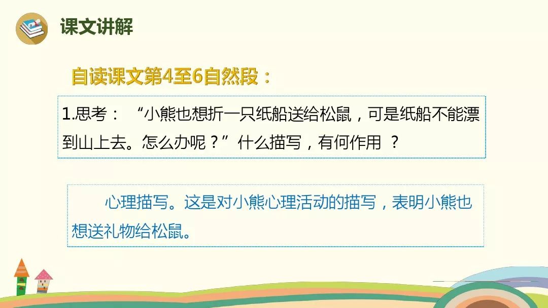 1.小熊也想折一只纸船送给松鼠,可是纸船不能漂到山上去。怎么办呢?他想了想,就扎了一只风筝。