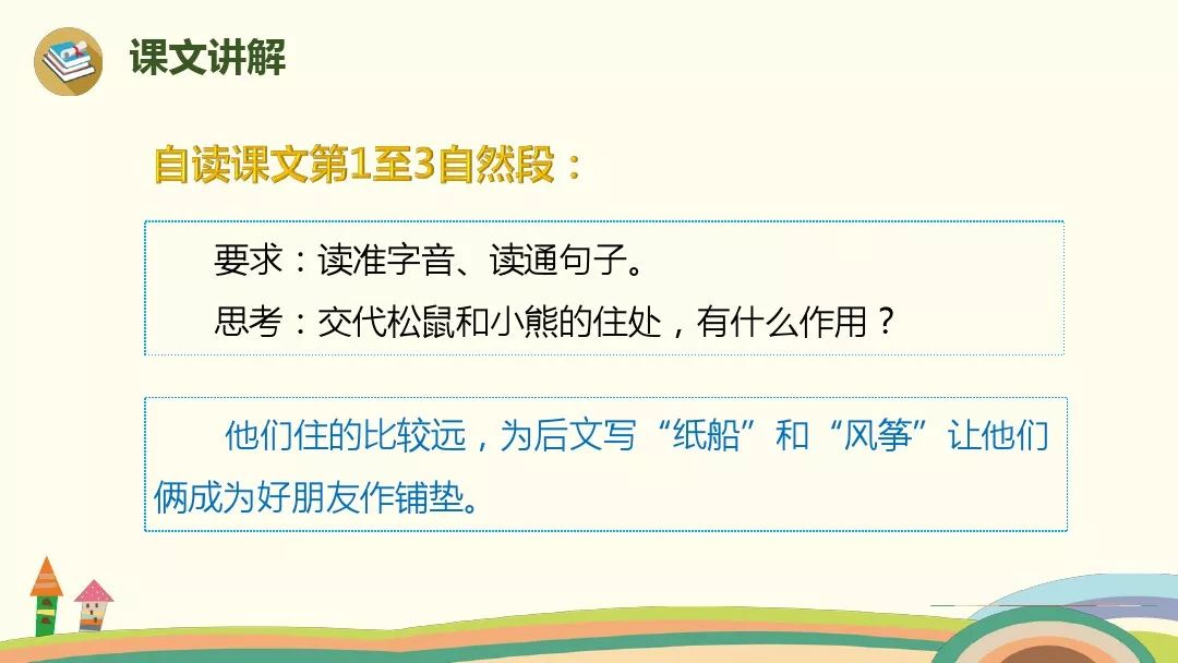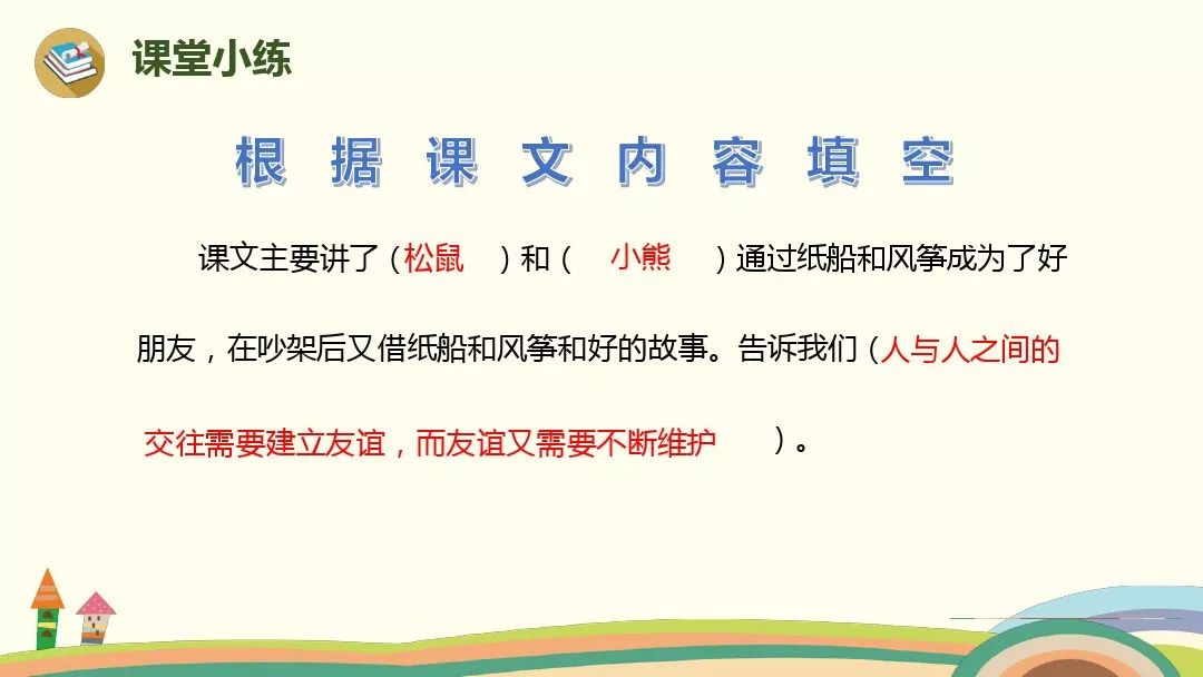 松鼠用纸船给小熊送去祝福与友情,小熊用风筝回应。于是他们成了好朋友。