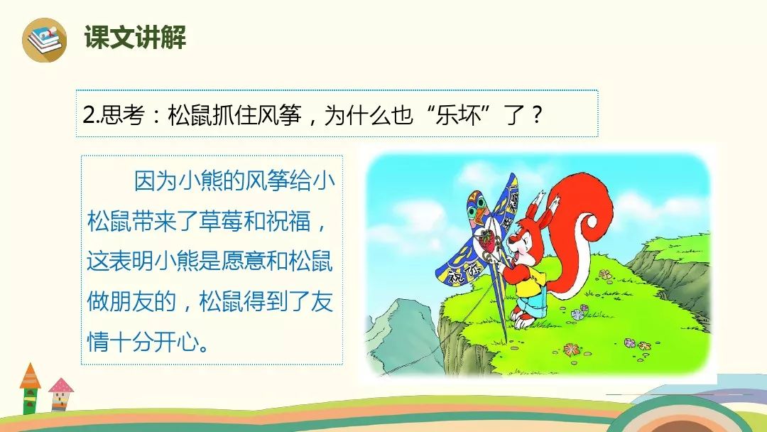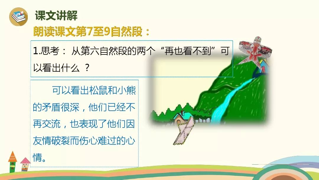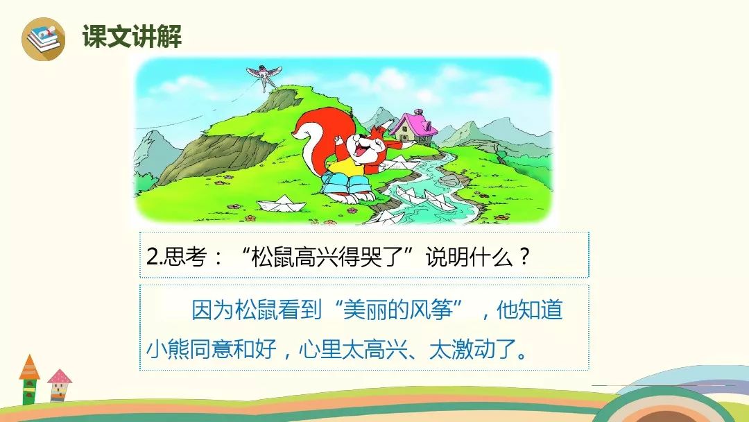“风筝朝他飞来”表示小熊同意和好。松鼠因为重新找回友谊而激动地哭了。