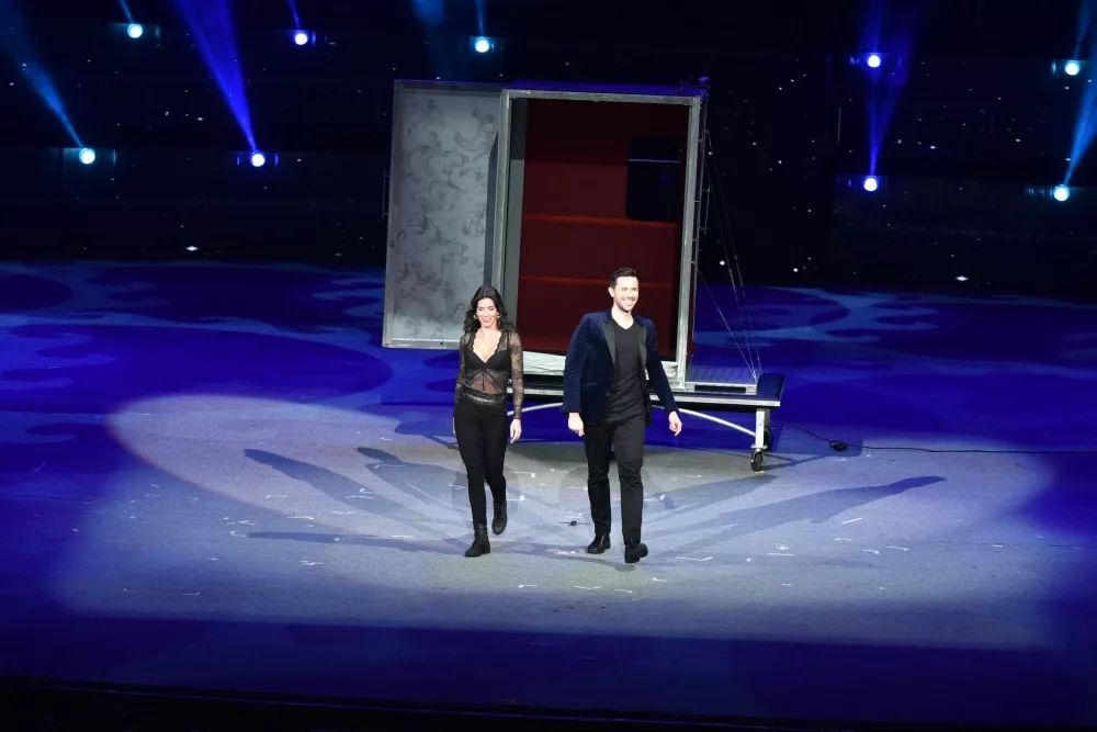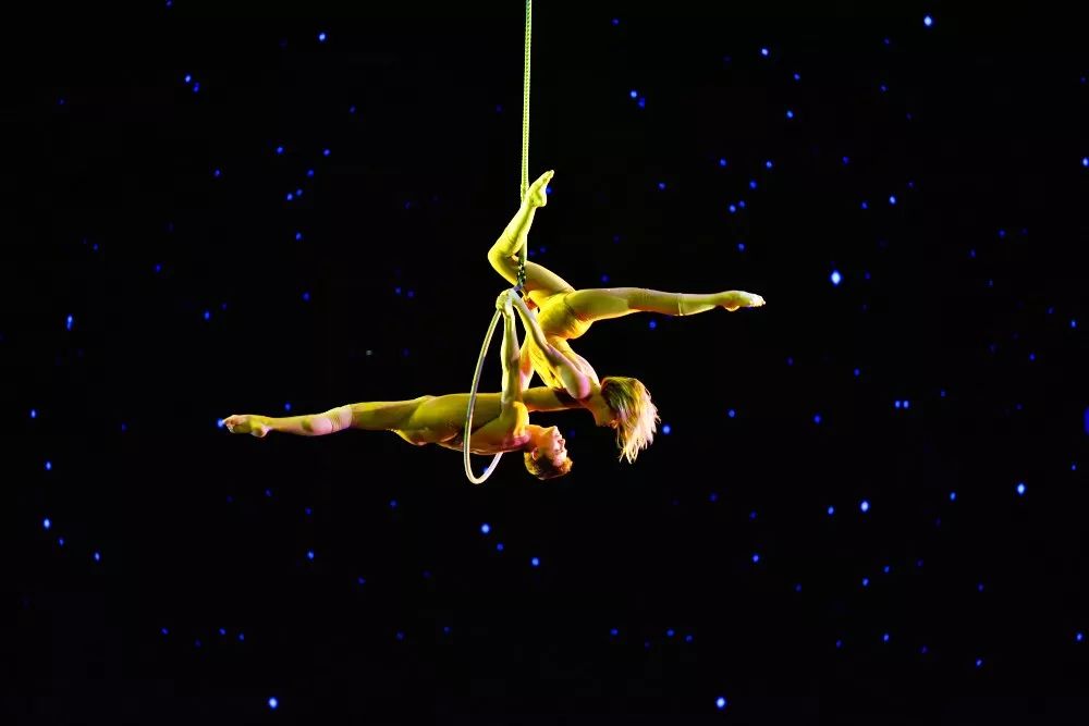 美国和加拿大马戏艺术家带来的《吊环》节目,展现出独特的表演风格、难度技巧。沿用利用升降旋转的调换在高空中完成“旋转挂腰提升”、“单提拉叉平衡造型”、“旋转前丫造型”、“后拉单背丫吊坠”、“提转双弯腰造型”等高难度工作。表演一气呵成,胆量出众,既体现杂技演员超高技能,又展现男女亲密无间的情爱场面。