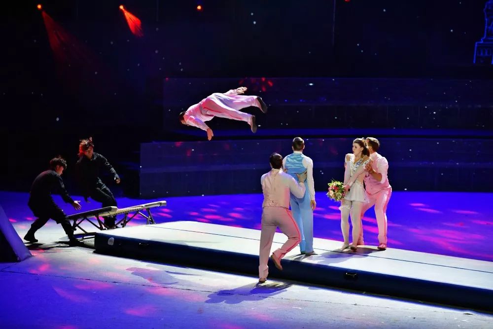 俄罗斯的节目《婚礼》,借助体操表演,融合俄罗斯民族舞蹈和杂技技艺,既有生活情趣,又有“前空翻3周落地”、“后空翻3周落地”、“拉拉提2周”等高难度动作。