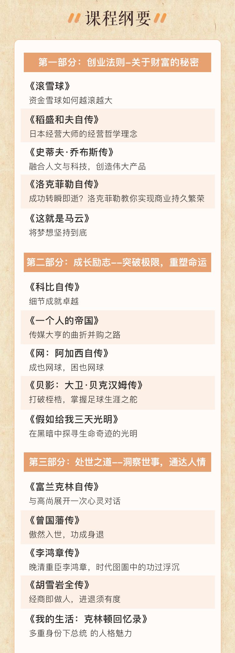 课程从传记人物的财富法则、人生历程、处事之道、思维密码、格局胸怀、魅力灵魂六大部分为你全方位解读,帮你扫除盲点;