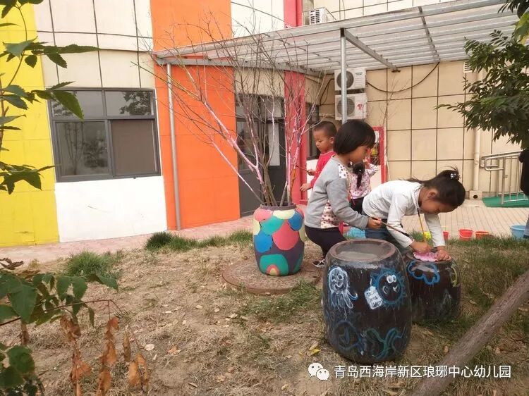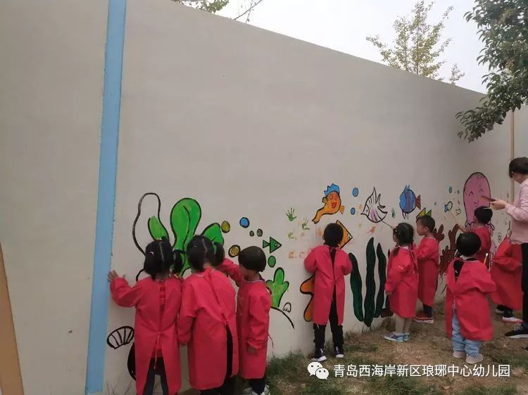 院落边,淡黄色的围墙需要美化。中二班小画家接到任务,立刻投入工作中,美妙的海底世界把院墙装饰的色彩斑斓。
