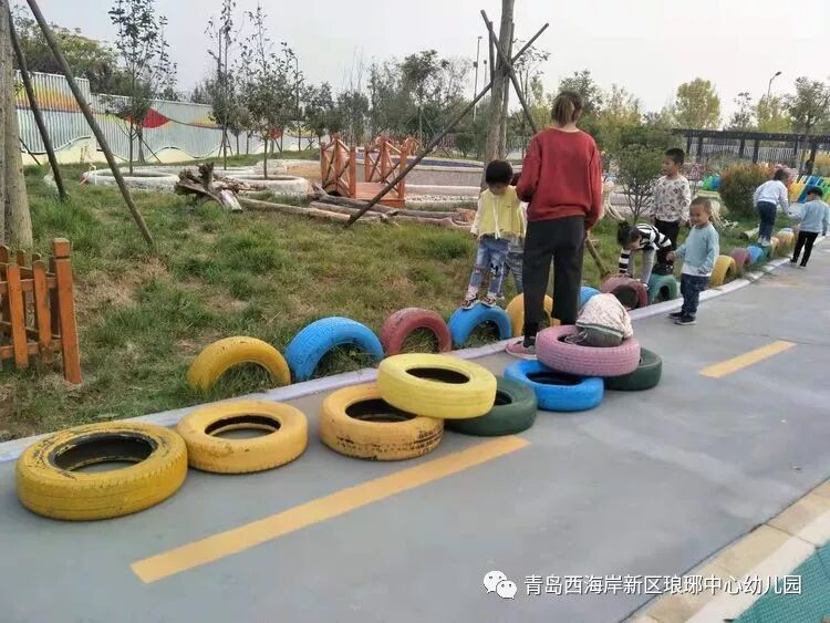 轮胎,易于收集,玩法多变,是幼儿园的标配。在我们的院子里随处可见,轮胎围栏、轮胎山洞、轮胎组合、轮胎山、轮胎桌椅……