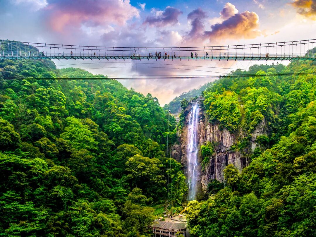 飞瀑流泉,璃桥架空爬过漫漫山路在此稍加停息看看这一望无际的绝美山水