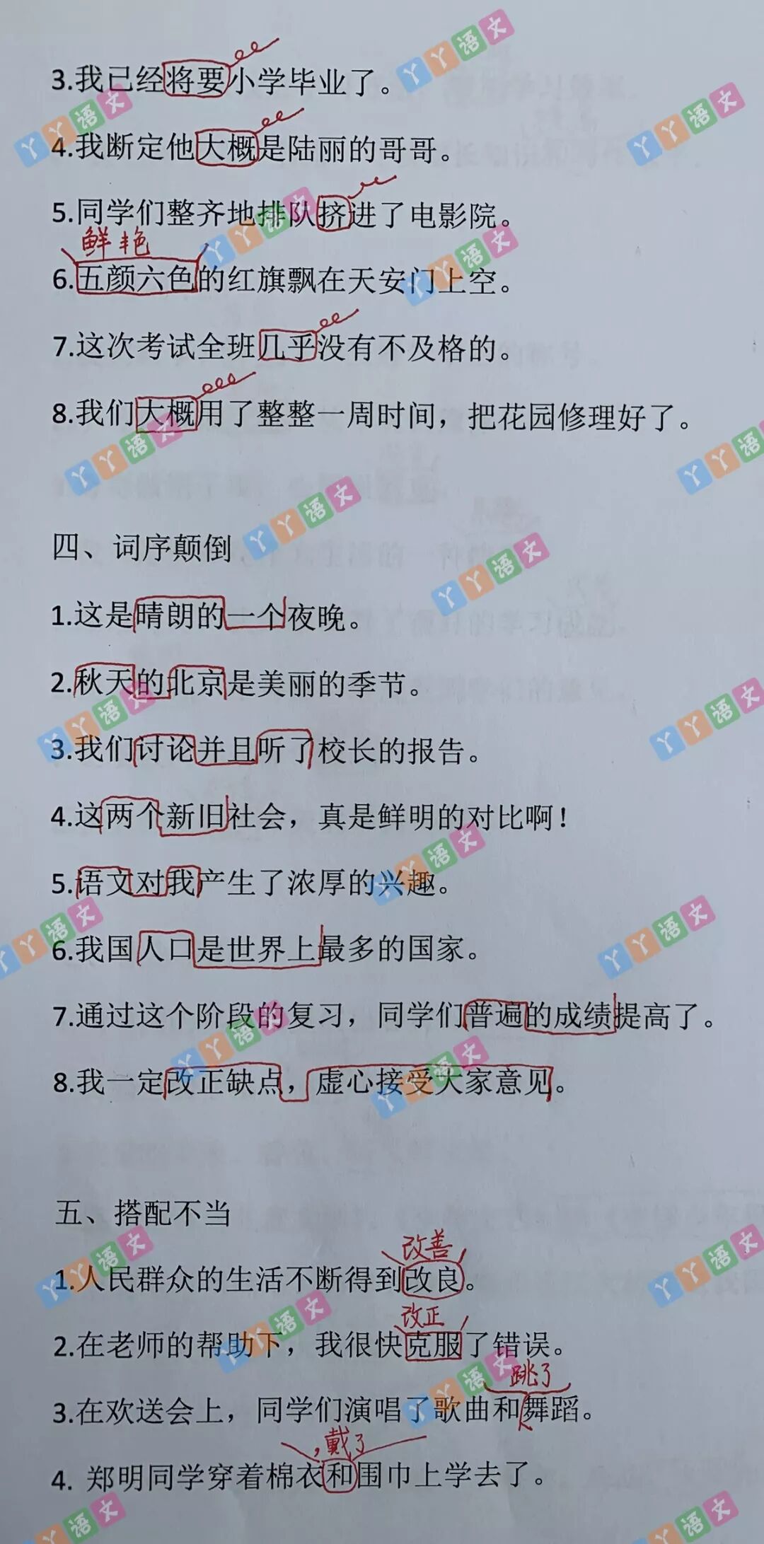 五、搭配不当 1.人民群众的生活不断得到改良。2.在老师的帮助下,我很快克服了错误。3.在欢送会上,同学们演唱了歌曲和舞蹈。4. 郑明同学穿着棉衣和围巾上学去了。5. 我们要不断改进学习方法,增加学习效率。?6. 我们阅读课外书籍,可以增长知识和写作水平。