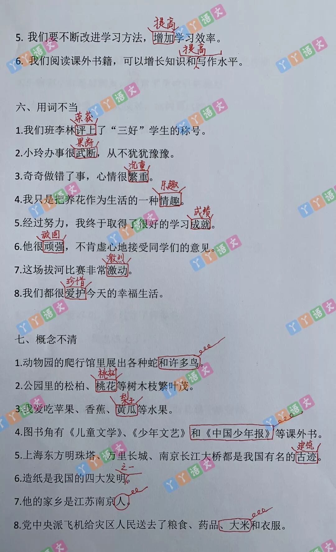 七、概念不清 1.动物园的爬行馆里展出各种蛇和许多鸟。2.公园里的松柏、桃花等树木枝繁叶茂。3.我爱吃苹果、香蕉、黄瓜等水果。4.图书角有《儿童文学》、《少年文艺》和《中国少年报》等课外书。5.上海东方明珠塔、万里长城、南京长江大桥都是我国有名的古迹。6.造纸是我国的四大发明。7.他的家乡是江苏南京人。8.党中央派飞机给灾区人民送去了粮食、药品、大米和衣服。