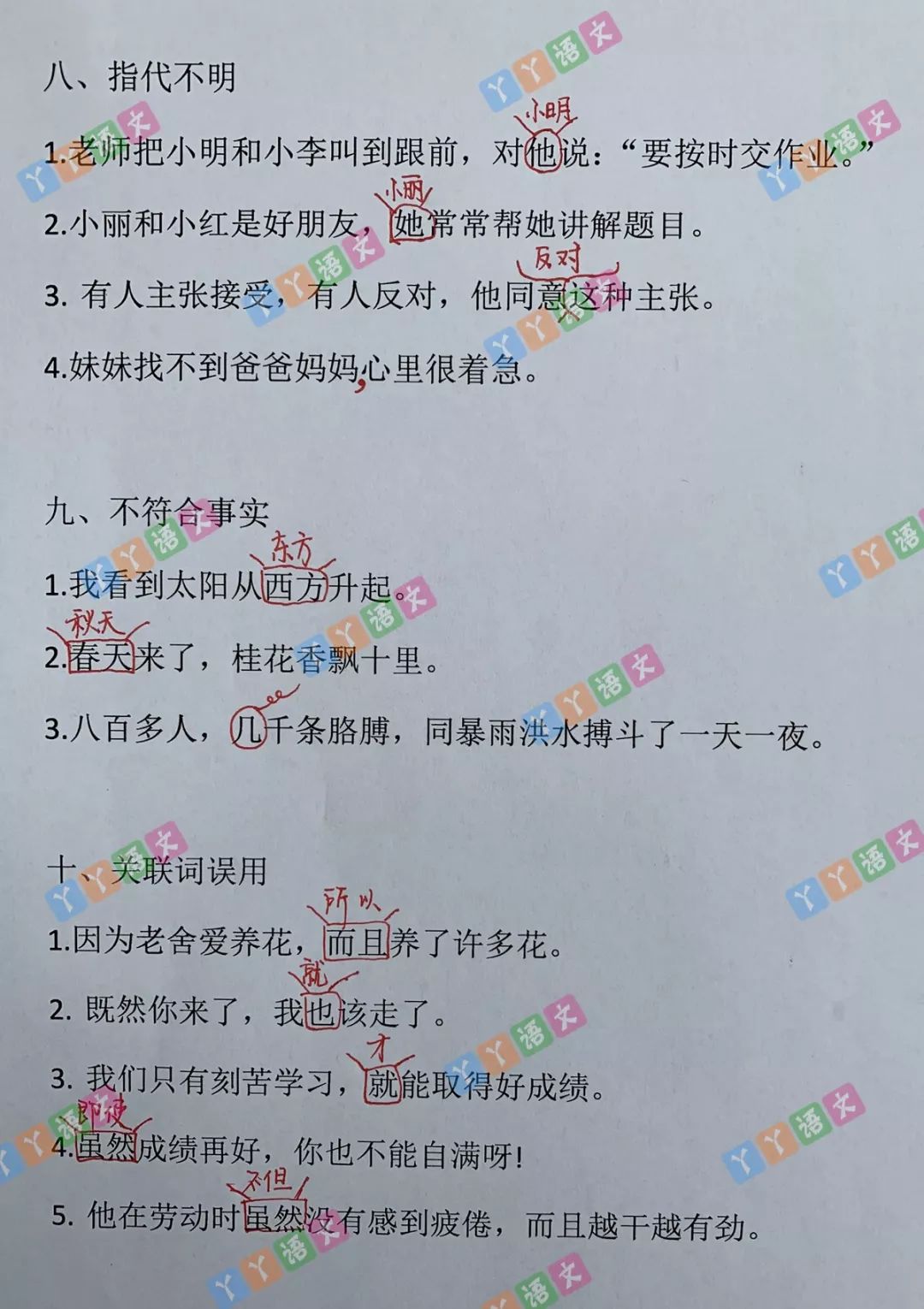 八、指代不明。指句子中出现多个人或状物时,指代不明确,含混不清。如“黄虹和赵燕一起去登仙楼山,她比她爬得快,她先登上仙楼山顶峰。”句子中的“她”有两个,到底是黄虹爬得快,还是赵燕爬得快呢?指代不明。应改为“……她比赵燕爬得快,她先登上仙楼山顶峰。”或“……黄虹比她爬得快,黄虹先登上仙楼山顶峰。”
