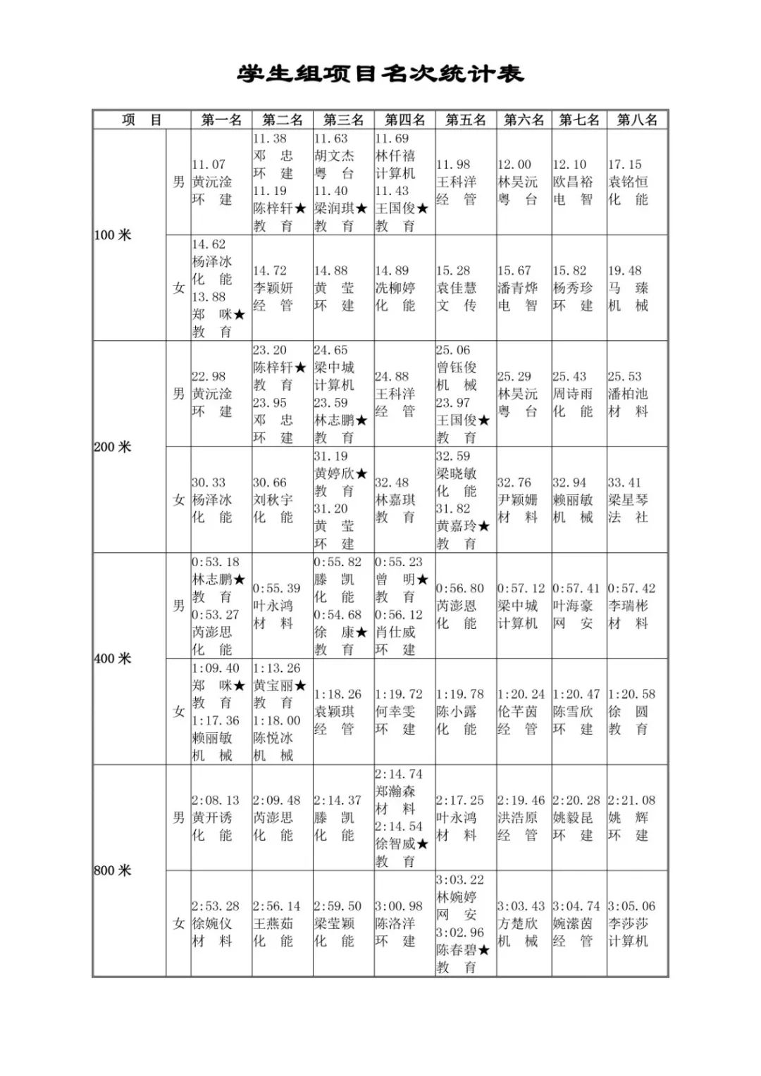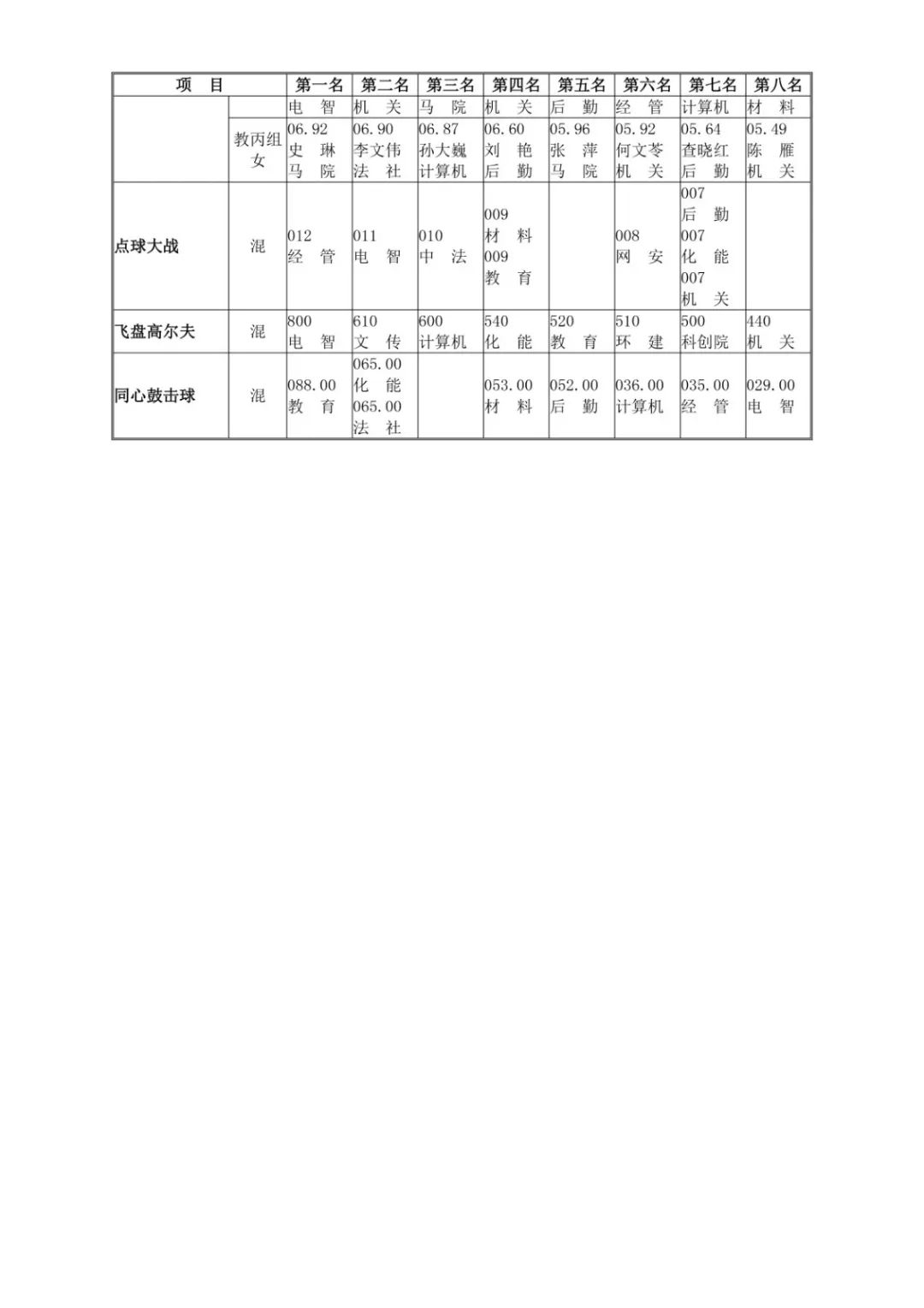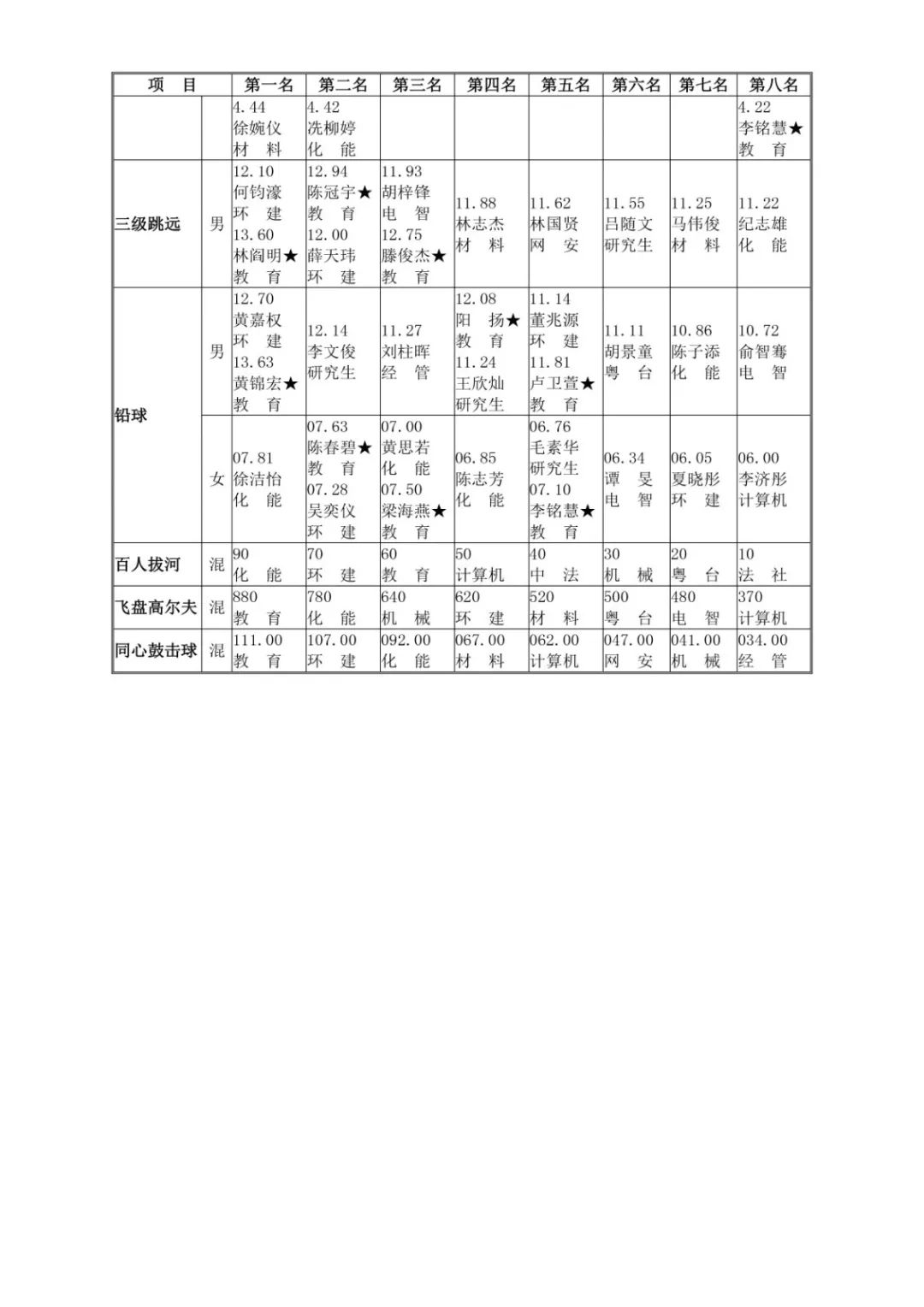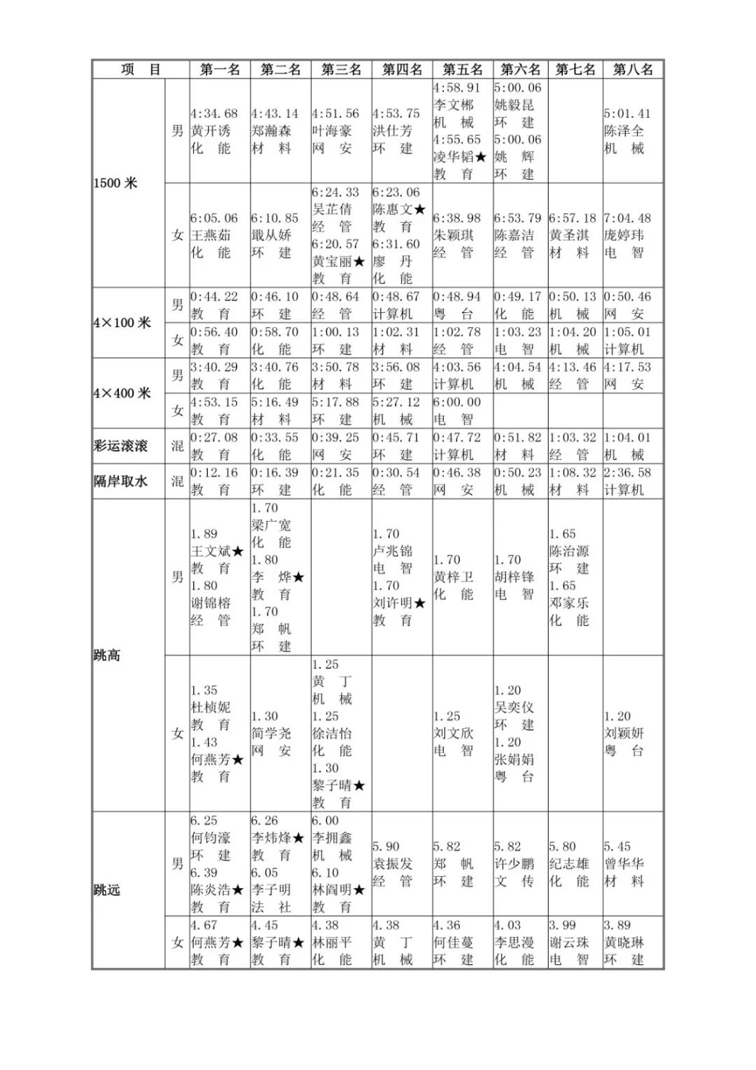 本次校运会化能学院积极进取、不断突破,第一次取得团体总分第二名的好成绩。为了此次比赛,化能田径队从9月1日就开始备赛,每天下午4点半准时训练包括径赛和田赛项目,每两周组织开展一次思想动员会。学院领导和老师在田径队的招新、训练方面也给予极大的支持和帮助。