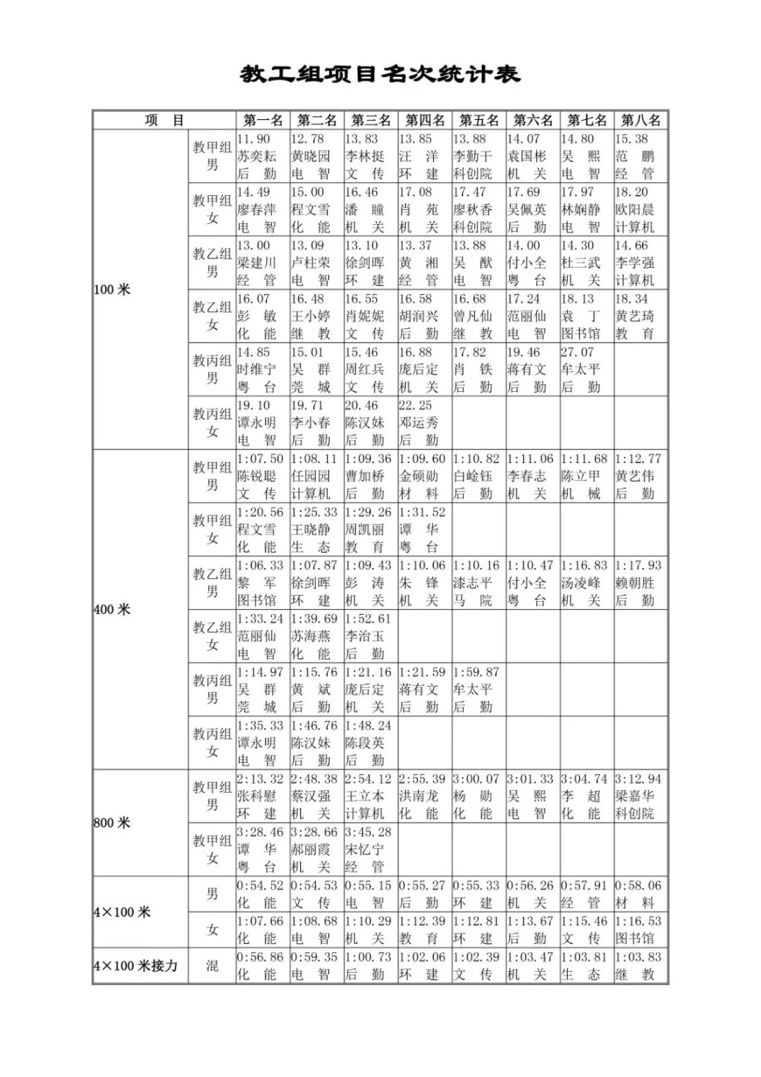 2019年10月24日,东莞理工学院为期两天的校运会圆满结束。化学工程与能源技术学院在此次校运会上取得突破性成就。本次此校运会,化能学院一共53人参赛,参与赛事49项,其中教师组单人项目共有16人参加,学生37人。教工组获得5金4银1铜,学生组获得8金9银8铜,在团体总评中获得学生男子团体总分第三名、学生女子团体总分第二名、学生组最佳组织奖、教工组优秀组织奖。
