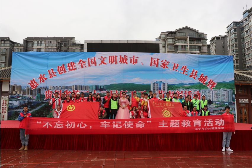 贵州大学科技学院法学与公共管理学部(以下简称“法管部”)受惠水县精神文明建设指导委员会邀请,于10月25日下午来到惠水县好花红广场,与当地的工作人员一同开展了由县精神文明委员会主办,县总工会、县综合行政执法局承办,以“不忘初心跟党走、牢记使命勇担当”为主题的关爱环卫工人公益志愿者活动。