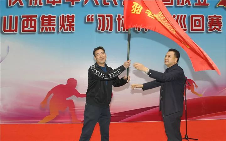 李堂锁为获得混合团体前四名的优胜单位颁奖,将羽毛球协会会旗交到下一届举办单位汾西矿业工会主席沙立杰手中。