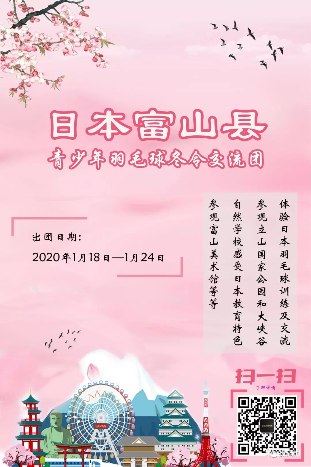 本次活动以日本富山教育委员会、日本富士县羽毛球协会、日本富士县地区旅游发展部作为背景,为加强中日双方羽毛球合作及培训。在广东省进行选拔,到富山县进行习训交流,每期交流团上限为40人,下限为8人。通过7天6晚的交流行程计划来体验日本青训系统,与5所日本全国前10的学校互相交流学习,参观TONAMI羽毛球训练基地。富山是人材辈出的羽毛球基地,例如大掘彩,西本拳太,小林忧吾,保木卓朗等,以及现役国家羽毛球队(A队)成员。