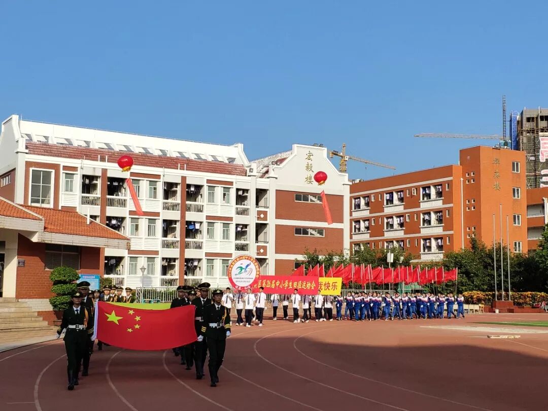 上午8时整,伴随着激昂奋进的《运动员进行曲》,国旗队步伐矫健地走向主席台。紧随其后的是气势昂扬、精神抖擞的彩旗队、花束队、腰鼓队、裁判员、运动员代表队。54个学校方阵踏着整齐的步伐依次入场,坚定、嘹亮的口号代表着学生运动员们激扬的斗志。