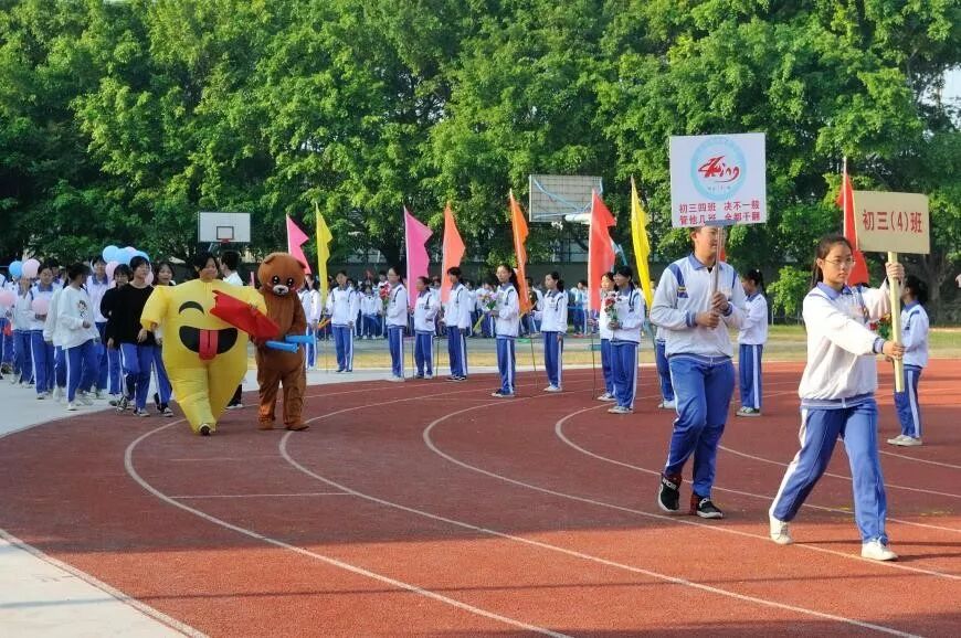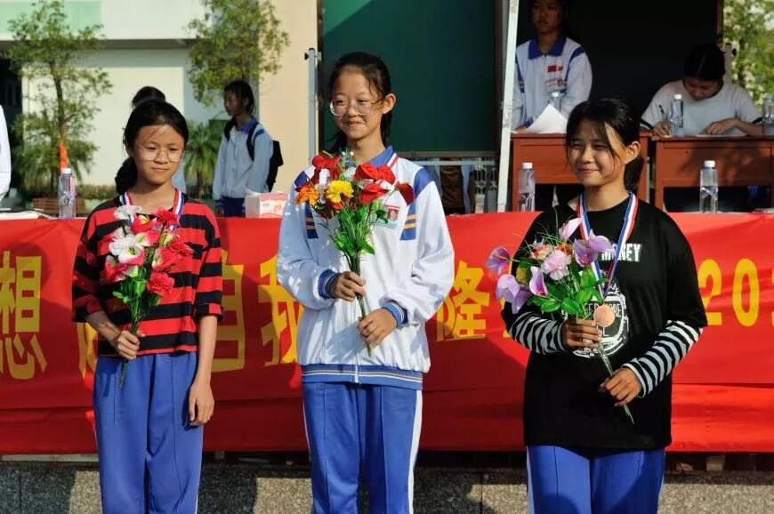 下午4点,运动会圆满结束。经过激烈的比拼,运动员们创造了多项优异成绩。初一(3)班、初二(2)班、初三(2)班、高 三(2)班分获初一、初二、初三、高中组总分第一名。本次比赛中,初二(2)班 林丹淇同学以1.25米成绩打破初二女子跳高的赛会纪录;高三(2)班的邹聪智同学 以6.56米成绩,打破高中男子跳远的赛会纪录;高三(2)班的林少博同学 以2分58.88秒的成绩,打破高中男子1000米的赛会纪录。