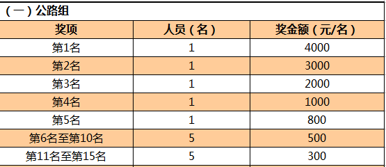 公路车竞赛组:使用标准公路赛车参赛,获奖名次前15名。