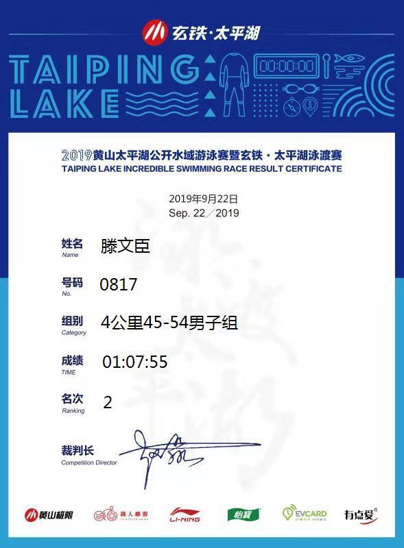 天道酬勤,这句古训放在哪里都适用!经过一个阶段相对科学有规律的训练,我的成绩在稳中有升!5月份参加亚太锦标赛,克服了热带燥人的闷热,成绩PB了半小时,在7月的玉门国际铁人三项赛中,我夺得了113公里组全场第一名,在一个星期后的连云港铁三赛中,人生第一次通过体育比赛获得奖金!进入9月,所有训练就开始围绕着大铁了,9月1号,新购置的铁三车首次参加比赛,虽然过程中不幸摔车!但是赛后总结中我得到了闪电车队郑屹的指导,严教练也开始给出冲刺阶段训练清单;在IRONMAN西安赛前,我还跟长期霸占大铁榜首的陆明刚大神交流训练体会;22日又把太平湖4公里泳渡当作训练赛完成,喜获40-50岁年龄组第2名,奖金达千元以上,更是极大鼓舞了信心!